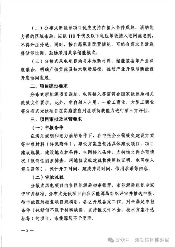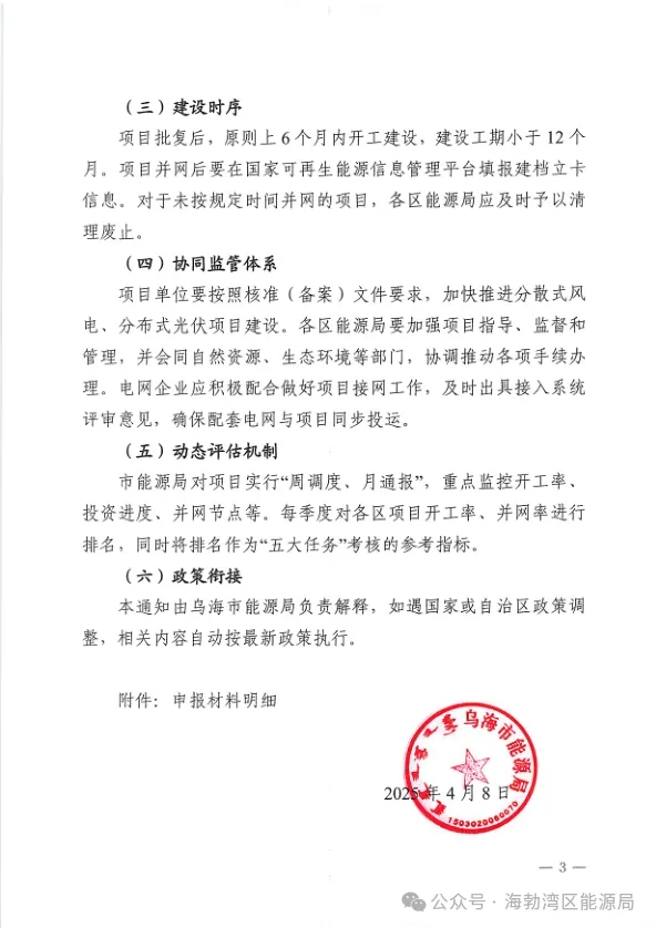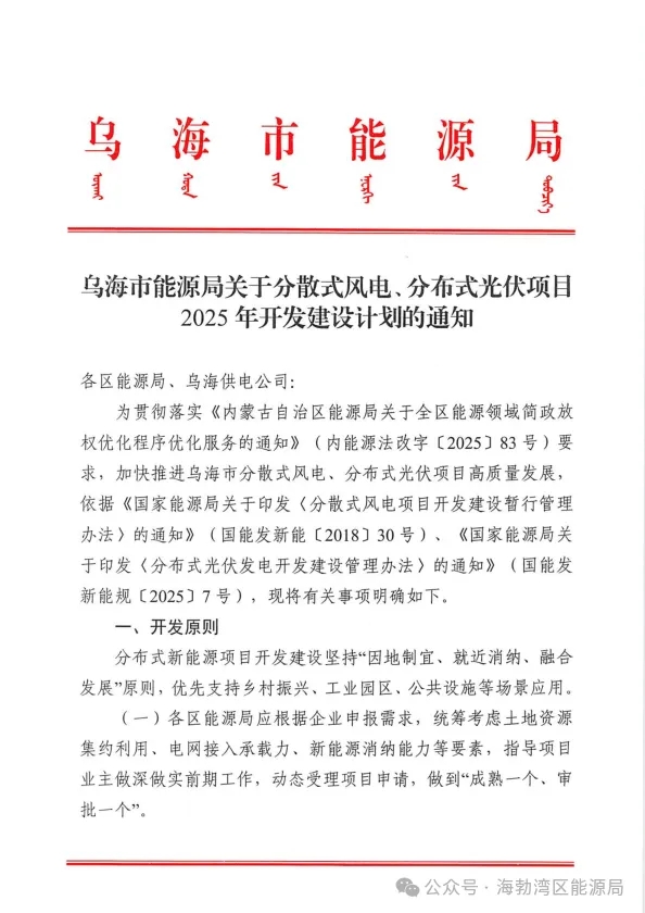 储能中国网获悉,日前,内蒙古乌海能源局下发关于分散式风电、分布式光伏项目2025年开发建设计划的通知。通知指出,分布式新能源项目开发建设坚持“因地制宜、就近消纳、融合发展”原则,优先支持乡村振兴、工业园区、公共设施等场景应用。 分布式新能源项目优先支持在接入条件成熟、消纳能力强的区域布局,应以110千伏及以下电压等级接入电网配电侧,不得升压外送。同时,按自愿原则配置储能,可结合需求灵活选择储能比例,鼓励采用共享储能模式。 《计划》指出,非自然人户用、一般工商业、大型工商业等分布式光伏项目在实施前应对屋顶荷载能力进行第三方评估。 此外,项目批复后,原则上6个月内开工建设,建设工期小于12个月。项目并网后要在国家可再生能源信息管理平台填报建档立卡信息。对于未按规定时间并网的项目,各区能源局应及时予以清理废止。 原文如下: