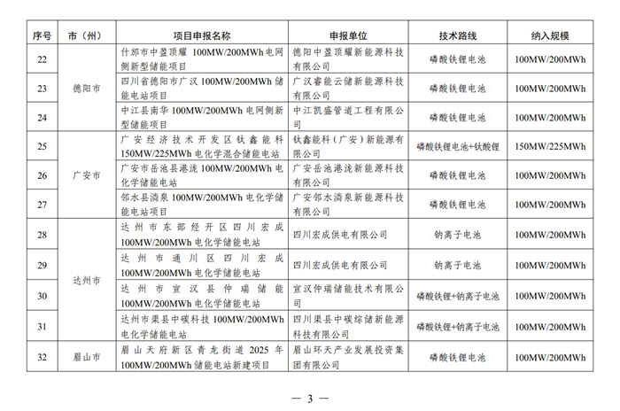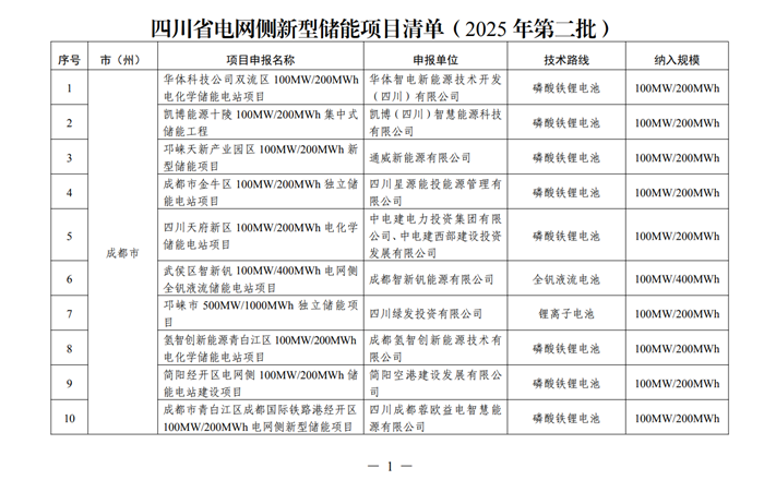 储能中国网获悉,10月24日,四川省发改委发布关于印发《四川省电网侧新型储能项目清单(2025年第二批)》的通知。本次列入的电网侧储能项目共35个,规模3.45GW/7.425GWh。其中, 成都13个项目,规模1.2GW/2.6GWh;自贡4个项目,规模400MW/1GWh;泸州4个项目,规模400MW/1GWh;德阳3个项目,共计规模300MW/600MWh;广安3个项目,共计共计规模350MW/625MWh;达州4个项目,共计规模共计规模400MW/800MWh;眉山4个项目,共计规模共计规模400MW/800MWh。 本次项目技术涉及包括磷酸铁锂电池、全钒液流电池、磷酸铁锂+钠离子电池、磷酸铁锂电池+钠离子电池、钠离子电池、磷酸铁锂电池+钛酸锂等。 关于印发《四川省电网侧新型储能项目清单(2025年第二批)》的通知 (川发改能源〔2025〕518号) 相关市(州)发展改革委、能源行业主管部门,能源运行主管部门,国网四川电力、有关企业: 为进一步增强电力系统调节能力,推动电网侧新型储能电站科学合理布局建设,省发展改革委、省能源局根据我省迎峰度夏电力保供情况,组织开展了项目征集遴选、评审工作,并形成《四川省电网侧新型储能项目清单(2025年第二批)》,现印发你们。 请项目业主按照市场化原则加快推进项目实施,争取早日建成投运。电网企业积极做好接入并网等工作,确保配套接网工程同步投产使用。相关地方行业主管部门加强对项目的指导、协调,强化项目调度,按月报送项目推进情况,自本通知印发之日起1年内未实质性开工建设的项目将予以调出项目清单。各有关单位均要切实履行安全生产责任,严格落实消防等管理要求,确保项目建设、运行安全。 附件:四川省电网侧新型储能项目清单(2025年第二批) 四川省发展和改革委员会 四川省能源局 2025年10月22日 |