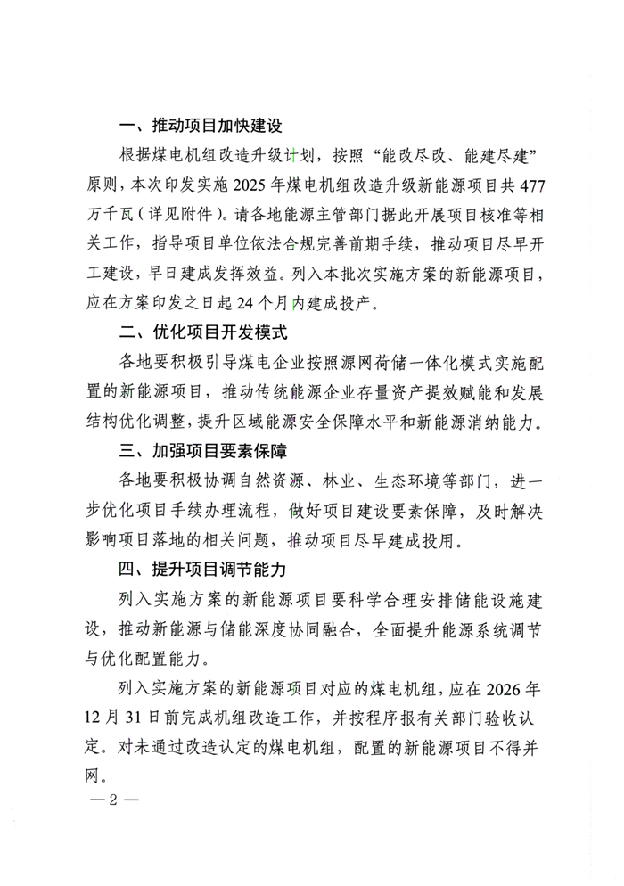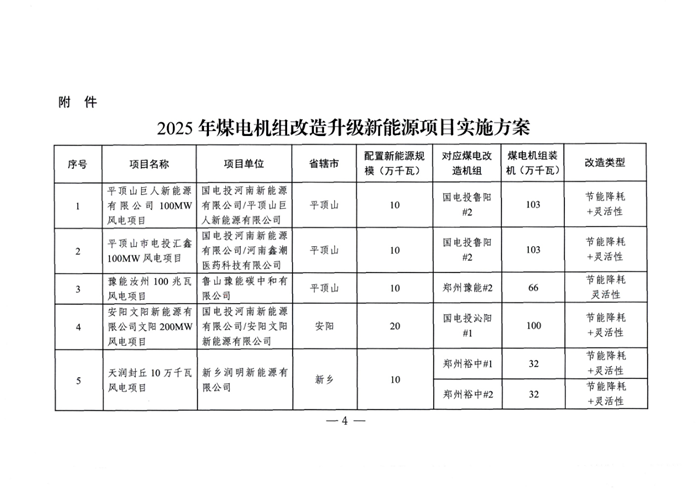 储能中国网获悉,近日,河南省发展和改革委员会发布关于印发2025年煤电机组改造升级新能源项目实施方案的通知。文件表示,根据煤电机组改造升级计划,按照“能改尽改、能建尽建原则,本次印发实施2025年煤电机组改造升级新能源项目共477万千瓦,均为风电项目。 其中指出,各地要积极引导煤电企业按照源网荷储一体化模式实施配置的新能源项目,推动传统能源企业存量资产提效赋能和发展结构优化调整,提升区域能源安全保障水平和新能源消纳能力。 列入实施方案的新能源项目要科学合理安排储能设施建设,推动新能源与储能深度协同融合,全面提升能源系统调节与优化配置能力。 列入实施方案的新能源项目对应的煤电机组,应在2026年12月31日前完成机组改造工作,并按程序报有关部门验收认定。对未通过改造认定的煤电机组,配置的新能源项目不得并网。 文件要求,列入本批次实施方案的新能源项目应在方案印发之日起24个月内建成投产。 原文如下: