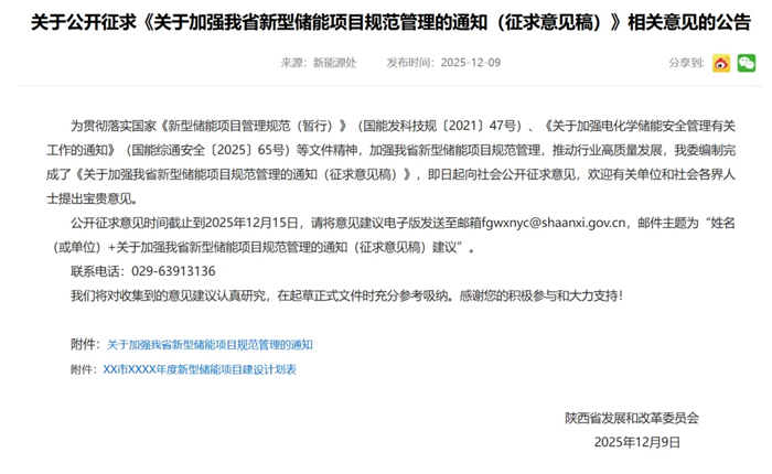 储能中国网获悉,2025年12月9日,陕西省发改委发布关于公开征求《关于加强我省新型储能项目规范管理的通知(征求意见稿)》相关意见的公告,征求稿要求各市科学评估储能需求,制定本地区新型储能项目年度建设计划并报送。电网企业应结合新型储能项目的功能定位,在确保电力系统安全运行的前提下,予以优先调用,保障新型储能利用率,充分发挥各类储能价值。 其中,征求稿指出,对于2025年底前未开工建设的陕湖直流一期、渭南新能源基地共享储能电站,由各市组织更换项目主体,或由基地新能源项目业主自行配置储能设施。新型储能项目应在取得备案文件后1年内开工建设,未按期开工建设的项目及时调出年度建设计划。备案后2年内未开工建设的项目,依法依规取消项目并移除已向社会公示的备案信息,相应电网接入意见同步作废。 原文如下: