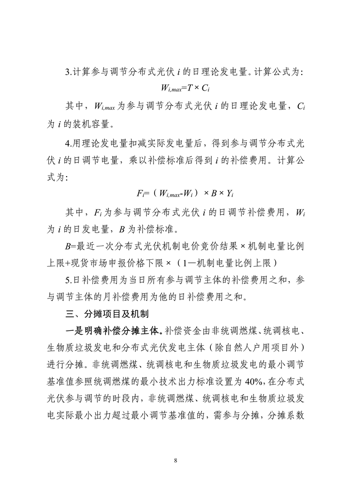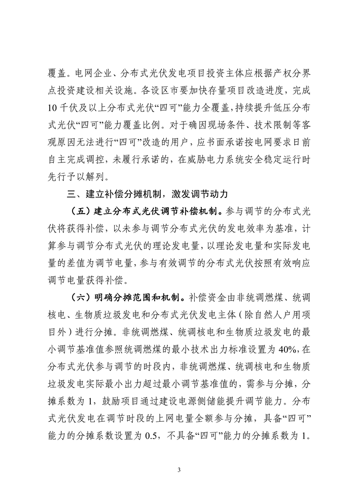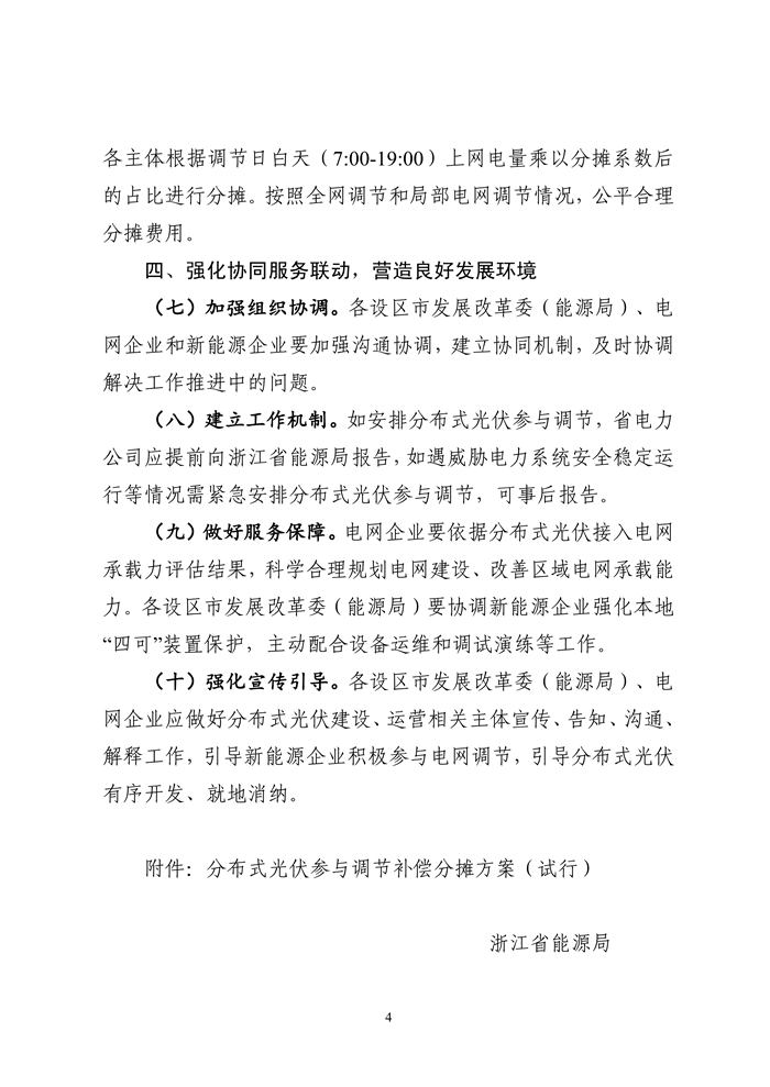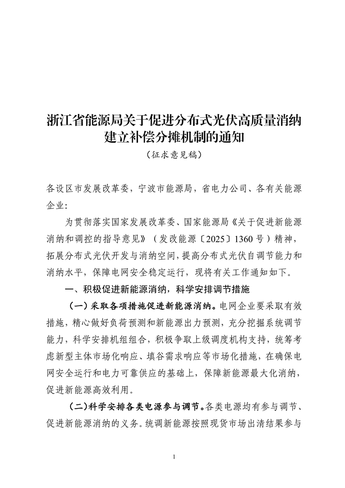 储能中国网获悉,浙江省能源局布关于公开征求《浙江省能源局关于促进分布式光伏高质量消纳建立补偿分摊机制的通知(征求意见稿)》意见的通知。征求意见稿指出,存量项目要按计划完成“四可”改造;增量项目在并网时同步实现“四可”能力,确保全覆盖。 参与调节的分布式光伏将获得补偿,以未参与调节分布式光伏的发电效率为基准,计算参与调节分布式光伏的理论发电量,以理论发电量和实际发电量的差值为调节电量,参与有效调节的分布式光伏按照有效响应调节电量获得补偿。 补偿资金由非统调燃煤、统调核电、生物质垃圾发电和分布式光伏发电主体(除自然人户用项目外)进行分摊。 鼓励项目通过建设电源侧储能提升调节能力。分布式光伏发电在调节时段的上网电量全额参与分摊,具备“四可”能力的分摊系数设置为0.5,不具备“四可”能力的分摊系数为1。各主体根据调节日白天(7:00-19:00)上网电量乘以分摊系数后的占比进行分摊。按照全网调节和局部电网调节情况,公平合理分摊费用。 征求稿表示,电网企业要采取有效措施,精心做好负荷预测和新能源出力预测,充分挖掘系统调节能力,科学安排机组组合,积极争取上级调度机构支持,统筹考虑新型主体市场化响应、填谷需求响应等市场化措施,在确保电网安全运行和电力可靠供应的基础上,保障新能源最大化消纳,促进新能源高效利用。 各类电源均有参与调节、促进新能源消纳的义务。统调新能源按照现货市场出清结果参与调节,非统调集中式新能源按照调度指令参与调节。在日间用电负荷较低、新能源出力较高的节假日等特殊时段,以及重大基建停电等特殊情况下,当各项消纳手段全部用尽、分布式光伏无法全额消纳时,电网企业组织分布式光伏参与调节。按照“先高压、后低压”“优先调控工商业项目”的原则参与调节,在消纳缺口较大时,对不具备调度端远程控制条件的分布式光伏,可根据调节原则在日前安排整站停运,具体调节清单和执行顺序由各设区市发展改革委(能源局)会同各地电网企业制定发布。 原文如下: 关于公开征求《浙江省能源局关于促进分布式光伏高质量消纳建立补偿分摊机制的通知(征求意见稿)》意见的通知 为贯彻落实国家发展改革委、国家能源局《关于促进新能源消纳和调控的指导意见》(发改能源〔2025〕1360号)精神,拓展分布式光伏开发与消纳空间,提高分布式光伏自调节能力和消纳水平,保障电网安全稳定运行,我局起草了《浙江省能源局关于促进分布式光伏高质量消纳建立补偿分摊机制的通知(征求意见稿)》,现公开征求社会意见,征求意见时间为2026年1月7日至2月8日。如有意见建议,请以电子邮件或信函方式反馈至省能源局新能源处,并注明“浙江省能源局关于促进分布式光伏高质量消纳建立补偿分摊机制的通知反馈意见建议”字样。 联系人:杜国伟;联系电话:0571-87052582; 电子邮件:zjnyjxnyc@163.com; 邮寄地址:浙江省杭州市西湖区省府路8号;邮编:310025。 企事业单位反馈意见,请注明单位名称、组织代码、联系人、联系方式。个人反馈意见,请注明姓名、身份证号、联系方式。 附件:浙江省能源局关于促进分布式光伏高质量消纳建立补偿分摊机制的通知(征求意见稿) 浙江省能源局 2026年1月7日