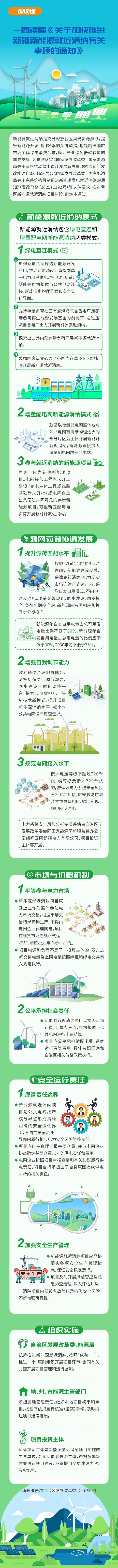 解读如下: 自治区发展改革委、能源局有关负责同志就《关于加快推进新疆新能源就近消纳有关事项的通知》答记者问 为进一步发挥自治区风光资源优势,加快实现新能源更高水平就近消纳,近日,自治区发展改革委印发《关于加快推进新疆新能源就近消纳有关事项的通知》(以下简称《通知》),自治区发展改革委、能源局有关负责同志就《通知》有关情况回答了记者提问。 问:请问《通知》出台背景是什么? 答:新能源就近消纳是充分释放我区风光资源禀赋,提升新能源开发利用效率的关键举措,也是精准响应市场主体绿电消费诉求,助力产业绿色低碳转型的重要支撑。为贯彻落实国家发展改革委、国家能源局《关于有序推动绿电直连发展有关事项的通知》(发改能源〔2025〕650号)要求,自治区发展改革委、能源局聚焦我区高载能产业减碳、出口外向型企业增绿、燃煤自备电厂绿电替代、增量配电网绿色转型、国家级零碳园区建设等需求,在国家政策框架内创新形成自治区新能源就近消纳模式,经广泛征求各方意见和建议,反复论证完善,最终形成《通知》。 问:《通知》的主要内容是什么? 答:《通知》主要内容分为五部分,一是拓展新能源就近消纳模式,将新能源就近消纳模式分为绿电直连、增量配电网新能源消纳两类;二是统筹源网荷储协调发展,提出源荷匹配、自我调节能力、接入电网等方面技术要求;三是落实市场与价格机制,规范项目参与电力市场及有关费用承担要求;四是明确安全运行责任,在项目责任边界、安全生产管理等方面,对新能源就近消纳项目和电网企业提出具体要求;五是统筹组织实施,明确了项目申报、评审、建设、退出和后评价等工作责任单位,做好项目管理工作。同时,《通知》后附新能源就近消纳项目操作指南,进一步细化新能源就近消纳项目在投资主体、规模配置、接入电网、交易结算、组织实施等方面的具体要求,引导项目投资主体科学规范开展项目建设。 问:新能源就近消纳项目建设需具备什么条件? 答:《通知》明确新能源就近消纳包含绿电直连、增量配电网新能源消纳两类模式。绿电直连模式支持以下4种类型:一是新增负荷通过配套建设新能源项目实施绿电直连;二是拥有自备电厂的存量负荷在足额清缴可再生能源发展基金后,通过压减自备电厂出力开展绿电直连;三是出口外向型企业配套新能源开展绿电直连,涉及存量负荷的需取得电网公司评估支持意见;四是国家级零碳园区内的存量负荷开展绿电直连,相关存量负荷需取得电网公司评估支持意见。增量配电网新能源消纳模式是指新能源直接接入增量配电网整体或具有清晰供电边界的部分供电片区内部,开展新能源就近消纳。对于参与新能源就近消纳的新能源,原则上应为新建项目。电网接入工程尚未开工建设或电网企业出具无法并网意见的存量新能源项目,也可参与新能源就近消纳。 问:新能源就近消纳项目有哪些关键技术要求? 答:新能源就近消纳项目技术要求高、统筹事项多,需要系统谋划、科学设计。《通知》在项目配置、电网接入等方面明确技术要求。项目配置方面,项目需要按照“以荷定源”原则,合理确定新能源建设规模,并鼓励通过合理配置储能、挖掘用户灵活调节潜力等方式增强项目调节能力,满足自发自用电量占总用电量的比例等指标要求,提升新能源消纳水平,减轻公共电网调节压力。电网接入方面,新能源就近消纳项目接入电压等级原则上不超过220千伏,采用220千伏电压等级接入的应开展电力系统安全风险分析专项评估,现阶段在新疆电力现货市场连续正式运行前,应安装防逆流装置或具备相应功能,不向电网反送电。 问:《通知》在新能源就近消纳项目市场与价格机制方面做了哪些规定? 答:《通知》从市场主体身份、履行交易结果、承担相关费用等方面对新能源就近消纳项目做出规定,保障新能源就近消纳项目顺利运行。一是作为整体参与电力市场交易,不得由电网企业代理购电,在电力现货市场连续正式运行前参照批发用户参与市场。对于项目电源和负荷不是同一投资主体的,双方之间交易电量及上网电量按照绿证和绿电交易有关规定执行。二是项目根据市场交易结果安排生产,除发生影响公用系统安全稳定运行的突发情况外,调度机构应按照项目自主安排的发用电曲线下达调度计划。三是新能源就近消纳项目以接入点为计量、结算参考点,作为整体与公共电网进行电费结算,并按照国家和自治区相关价格政策,公平承担输配电费、系统运行费等费用。 问:《通知》在新能源就近消纳项目安全运行方面有哪些考虑? 答:新能源就近消纳项目与公共电网以产权分界点作为安全责任边界,各自在安全责任界面内分别履行相应电力安全风险管控责任。在供电责任方面,新能源就近消纳项目应自主合理申报并网容量,与电网企业协商确定并网容量以外的供电责任和费用,电网企业按照项目申报容量和有关协议履行供电责任,项目自行承担因自身原因造成供电中断的相关责任。在安全风险方面,新能源就近消纳项目加强安全生产管理,严格落实各项安全生产管理措施,开展风险管控及隐患治理排查,保证安全稳定运行。 问:下一步将如何组织实施? 答:自治区发展改革委、能源局将按照“成熟一个、推进一个”原则,组织开展项目评审,会同有关方