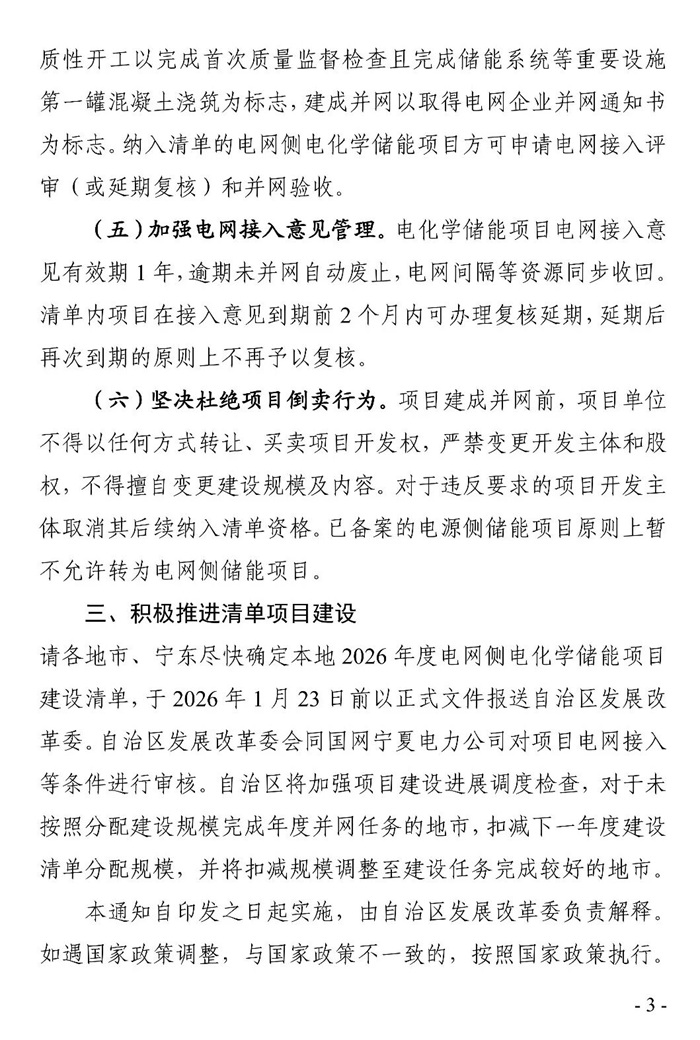 储能中国网获悉,2026年1月20日,宁夏自治区发改委发布关于进一步规范2026年电网侧电化学储能项目管理的通知。其中通知指出,已备案的电源侧储能项目,原则上暂不允许转为电网侧储能项目。 通知表示,加快建立项目清单。各地市、宁东对电网侧电化学储能项目实行清单式管理。纳入年度建设清单项目须具备在一年内接入电网的条件。原则上2025年12月23日前已实质性开工项目,获得专项债支持且已取得电网接入意见项目全部纳入清单。 纳入年度建设清单的项目,须在清单公布后的6个月内实质性开工,12个月内建成并网。电化学储能项目电网接入意见有效期1年,逾期未并网自动废止,电网间隔等资源同步收回。清单内项目在接入意见到期前2个月内可办理复核延期,延期后再次到期的原则上不再予以复核。 文件强调,坚决杜绝项目倒卖。在项目建成并网前,项目单位不得以任何方式转让、买卖项目开发权,严禁变更开发主体和股权,不得擅自变更建设规模及内容。对于违反要求的项目开发主体,取消其后续纳入清单资格。 通知表示,原则上2025年12月23日前已实质性开工项目,获得专项债支持且已取得电网接入意见项目全部纳入清单。各地市、宁东切实落实建设清单管理责任,根据清单内项目建设进展,调整建设清单,并在政府网站公布,调出清单项目一年内不得再次调入。 鼓励已建成电化学储能项目按照4小时及以上时长标准实施改造,在不改变原有项目功率的前提下暂不纳入建设清单管理。 原文如下: