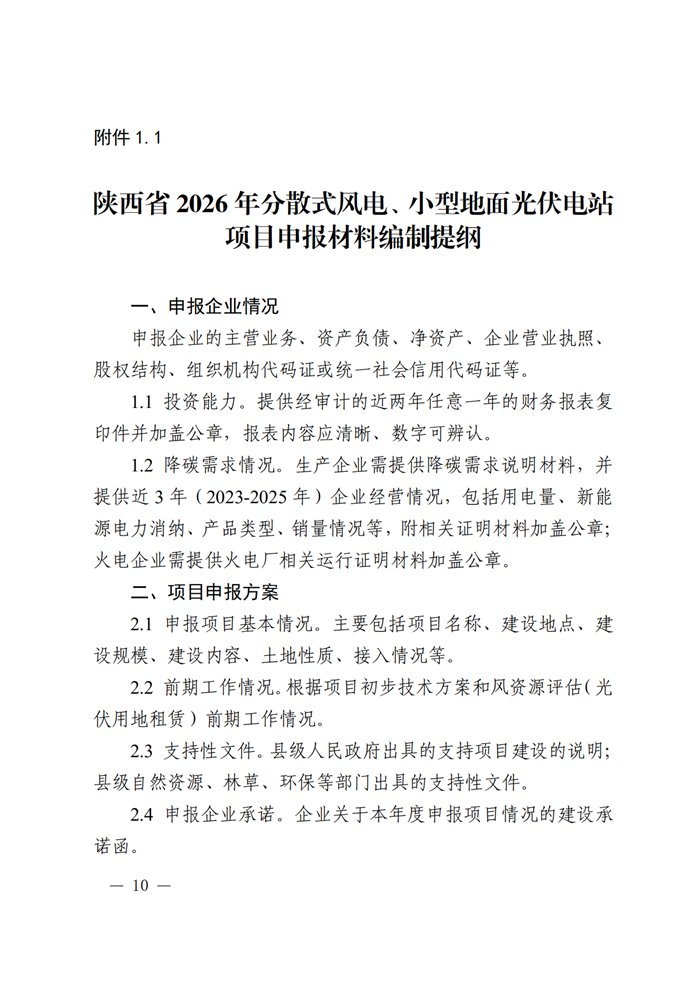 储能中国网获悉,日前,陕西省发改委发布关于开展陕西省2026年分散式风电小型地面光伏电站项目申报工作的通知。通知表示,各地市申报规模上限为5.45GW。其中榆林市申报规模不超过80万千瓦、延安市不超过75万千瓦,关中地区各市不超过60万千瓦,陕南地区各市不超过30万千瓦。 各分散式风电、小型地面光伏电站项目单体规模不超过5万千瓦(不含),鼓励新能源项目按照不低于装机容量的10%、时长2小时配置新型储能。预计配储规模约545MW/1090MWh。 通知指出,纳入建设清单的风电项目应于2027年6月底前完成核准,2028年6月底前全容量并网;光伏项目应于2026年12月底前完成备案,2027年12月底前全容量并网。 在项目并网模式上,可以选择全额上网,也可以选择直接接入高耗能项目负荷侧自发自用方式。采用全额上网方式时,接入系统电压等级不超过110千伏;选择自发自用方式时间,年自发自用电量占总可用发电量比例不低于95%,上网电量不高于5%。 申报企业应为国家对绿色电力消费比例有要求的电解铝、钢铁、水泥、多晶硅、已通过国家窗口指导的数据中心行业企业,或有降碳刚需的高耗能企业(含能化、有色、建材和火电等行业)。 原文如下: