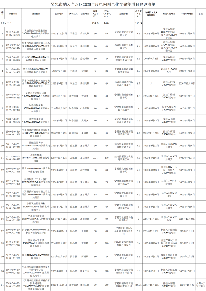储能中国网获悉,2月9日,吴忠市发展和改革委员会发布关于对吴忠市纳入自治区2026年度电网侧电化学储能项目建设清单的公示。根据公示项目清单,本次共21个项目,规模为4.785GW/14.54GWh,总投资为145.85亿元。计划并网时间均在2026年12月30日前并网。 原文如下: 吴忠市发展和改革委员会关于对吴忠市纳入自治区2026年度电网侧电化学储能项目建设清单的公示 按照自治区发展改革委《关于进一步规范2026年电网侧电化学储能项目管理的通知》(宁发改新能源〔2026〕35号)要求,为有序推进我市电网侧电化学储能项目建设,助力能源结构优化升级,现将我市纳入自治区2026年度项目建设清单进行公示(见附件),公示期3个工作日,即2026年2月9日起至11日18:00止。如有异议,请将意见以书面形式送至市发展改革委能源科(吴忠市行政中心216室)。 联系方式:0953-2039808 附件:吴忠市纳入自治区2026年度电网侧电化学储能项目建设清单 吴忠市发展和改革委员会 2026年2月9日
