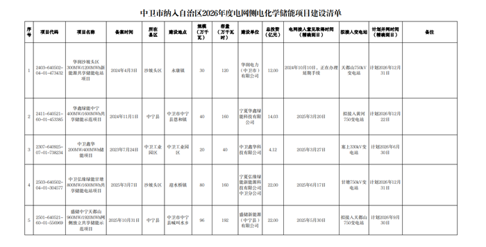 储能中国网获悉,2月9日,宁夏中卫市发展和改革委员会发布关于纳入2026年度自治区电网侧电化学储能项目建设清单有关结果的公示。经审核反馈,中卫市拟纳入2026年度自治区电网侧电化学储能项目建设清单项目共6个,总规模338万千瓦/816万千瓦时。 原文如下: 宁夏中卫市发展和改革委员会关于纳入2026年度自治区电网侧电化学储能项目建设清单有关结果的公示 按照自治区发展改革委《关于反馈2026年度电网侧电化学储能项目建设清单审核意见的函》,经审核反馈,我市拟纳入2026年度自治区电网侧电化学储能项目建设清单项目共6个,总规模338万千瓦。 现将已纳入2026年度自治区电网侧电化学储能项目建设清单项目进行公示。公示期3个工作日,即2026年2月9日起至2月11日18:00止。如有异议,请将意见以书面形式送至我委能源与交通科。联系方式:0955-7068775。 附件:中卫市纳入自治区2026年度电网侧电化学储能项目建设清单 中卫市发展和改革委员会 2026年2月9日