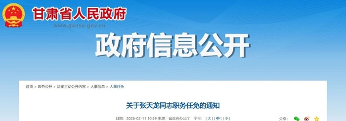 关于张天龙同志职务任免的通知 各市、自治州人民政府,甘肃矿区办事处,兰州新区管委会,省政府各部门,中央在甘各单位: 甘肃省人民政府决定: 张天龙任甘肃省能源局局长(副厅长级),免去其甘肃省发展和改革委员会副主任职务。 甘肃省人民政府2026年2月9日 |
