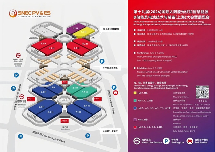 SNEC PV&ES+第十九届(2026)国际太阳能光伏和智慧能源&储能及电池技术与装备(上海)大会暨展览会 SNEC PV&ES+19th(2026) International Photovoltaic Power Generation and Smart Energy & Energy Storage and Battery Technology and Equipment Conference & Exhibition 邀请函 主题:光储融合,智领未来 展览时间:2026年6月3-5日 展馆地址:国家会展中心(上海虹桥) 展商数量:3600+ 展览面积:400000+ 参观人数:500000+ 展馆数量:15个馆 批准单位 上海市商务委员会 支持单位 上海市发展和改革委员会 上海市经济和信息化委员会 上海市科学技术委员会 牵头主办单位 亚洲光伏产业协会(APVIA) 中国可再生能源学会(CRES) 中国循环经济协会可再生能源专业委员会(CREIA) 上海市经济团体联合会(SFEO) 上海科学技术交流中心(SSTEC) 上海新能源行业协会(SNEIA) 联合主办单位 国际太阳能学会(ISES) 美国太阳能行业协会(SEIA) 日本太阳光发电协会(JPEA) 亚太光伏产业理事会(APPIC) 亚太新能源行业协会(NEIAAP) 中国机电产品进出口商会(CCCME) 中国可再生能源学会光电专业委员会(CPVS) 中国能源研究会可再生能源专业委员会 印度太阳能联合会(NSEFI) 台湾太阳光电产业协会(TPVIA) 韩国光伏行业协会(KOPIA) 马来西亚光伏产业协会(MPIA) Solar United 中东太阳能行业协会(MESIA) 沙特阿拉伯太阳能行业协会(SASIA) Solar GCC Alliance 巴基斯坦可再生能源学会(PRES) 伊朗可再生能源协会(IrREA) 德国商会大中华区德中生态商务平台 展览承办单位: 上海伏勒密科技有限公司 Follow Me Int’l Exhibition USA Inc. 前 言: 由亚洲光伏产业协会(APVIA)、中国可再生能源学会(CRES)、中国循环经济协会可再生能源专业委员会(CREIA)、上海市经济团体联合会(SFEO)、上海科学技术交流中心(SSTEC)、上海新能源行业协会(SNEIA)等25个国际机构和组织联合主办的“SNEC PV+&ES+第十九届(2026)国际太阳能光伏和智慧能源&储能及电池技术与装备(上海)大会暨展览会”(简称“SNECPV&ES+光伏&储能大会暨(上海)展览会”)将于2026年6月3-5日在中国上海-国家会展中心隆重举行。 “SNEC PV&ES+光伏&储能大会暨(上海)展览会”展览面积从2007年第一届的1.5万平方米,发展到2025年的38万平方米,来自全球95个国家和地区共3600多家企业参展,其中国际展商比例占30%,已经成为在中国、亚洲及全球最具影响力的国际化、专业化、规模化的光伏盛会。本届大会以“光储融合,智领未来”为主题,汇聚全球光伏与储能领域的顶尖企业、专家学者及行业领袖,共同探讨新能源技术革新、产业升级及可持续发展路径。 SNEC PV+&ES+光伏&储能展览会是全球最为专业的光伏展,其展出内容包括:光伏生产设备、材料、光伏电池、光伏应用产品和组件,以及光伏工程及系统、储能、移动能源等,涵盖了光伏产业链的各个环节。 SNEC PV+&ES+光伏&储能论坛形式也格外丰富多彩,涉及光伏产业未来市场趋势分析、合作发展策略、各国政策导向、行业最前沿技术、光伏金融等,是向业界展示成果的最佳机会。 我们期待着全球相关业者聚首中国·上海,从产业的视野、以问题为导向,一起把脉中国、亚洲及世界太阳能光伏发电市场,共同引领行业创新发展之路。愿我们相聚在2026年6月3-5日上海国家会展中心! SNEC PV&ES+(2026) POWER EXPO 热忱地欢迎您! 时间安排: 布展:2026年6月1-2日 9:00-20:00 展览:2026年6月3-5日 9:00-17:30 撤展:2026年6月5日 15:00-22:00 参展费用: 标准展位(豪标,3m x 3m): 国内企业:RMB23,800/个 外资企业:US$ 4,900/个 基本配置:一张咨询桌、两把折椅、一只废纸篓、一个220V/500W 电源插座、两个射灯、中英文楣板、展位内铺地毯。 室内光地(36平方米起租): 国内企业:RMB2,380 /M2 外资企业:US$ 490 /M2 室外光地: 国内企业:RMB2,180/M2 外资企业:US$460/M2 展出内容(展品属类): 太阳能光伏 A.光伏生产设备: 硅棒硅块硅锭生产设备:全套生产线、铸锭炉、坩埚、生长炉、其他相关设备; 硅片晶圆生产设备:全套生产线、切割设备、清洗设备、检测设备、其他相关设备; 电池生产设备:全套生产线、蚀刻设备、清洗设备、扩散炉、覆膜设备/沉积炉、丝网印刷机、其它炉设备、测试仪和分选机、其他相关设备; 电池板/组件生产设备:全套生产线、测试设备、玻璃清洗设备、结线/焊接设备、层压设备; 薄膜电池板生产设备:非晶硅电池、铜铟镓二硒电池CIS/CIGS、镉碲薄膜电池CdTe、染料敏化电池DSSC生产技术及研究设备; B.光伏电池:单晶硅、多晶硅、PERC、TOPCon、异质结、钙钛矿光伏电池、薄膜太阳能电池、PERC光伏组件、N型TOPCon光伏组件、柔性组件、矩形光伏组件、叠片式光伏组件、光伏电池产商、电池组件生产商、电池组件安装商、代理商、经销商及分销商; C.光伏原材料:硅料、硅锭/硅块、硅片、封装光伏玻璃、封装薄膜、其他原料等; D.光伏逆变器:单相逆变器、三相逆变器、多相逆变器、独立逆变器、户用逆变器、并网逆变器、离网逆变器、串联逆变器、集中式逆变器、组串式逆变器、集散式逆变器、微型逆变器等; E.光伏支架:太阳能光伏支架、铝合金支架、热镀锌支架、镀锌铝镁光伏支架、耐候钢光伏支架、固定式支架、单轴跟踪支架、双轴跟踪支架、屋顶类支架、地面类支架、水面类支架、BIPV光伏支架系统、车棚光伏支架、C型钢、光伏支架配件等; F.光伏相关零部件:蓄电池、充电器、控制器、汇流箱、转换器、记录仪、逆变器、监视器、支系统、追踪系统、太
