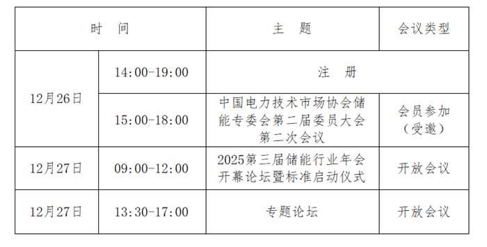 各有关单位: “十四五”以来,我国新型储能发展举世瞩目,实现了高质量跃升发展,已成为世界储能技术、场景应用的重要推动者。为实现新型储能产业“十五五”良好开局,响应国家能源局等相关部门下一步工作部署,为更好促进行业交流与合作,推进技术先进、安全高效的新型储能建设,挖掘新能源配建储能调节潜力。中国电力技术市场协会储能设备技术专委会拟定于12月26-27日在北京召开2025第三届储能行业年会暨系列论坛;会议期间还将举行“2025金储奖系列颁奖、储能电站优秀供应商授牌”和多项团体标准启动等系列活动。会议旨在分析2025年新型储能产业链各环节发展情况并研判2026年产业发展走势;推动新型储能从“跟跑”向“领跑”跃升发展和前沿技术应用,探索解决储能发展瓶颈的思路和方法,搭建了解政策信息、供需合作平台。 会议将邀请电力企业、储能设备厂商、储能系统集成商、施工建设单位、设计院所、研究机构、高校、咨询分析机构和地方行业组织的专家、学者及人员参会。现就有关事项通知如下: 会议主题:智慧协同 数字引领 会议时间:2025年12月26-27日(12月26日报到) 会议地点:北京·盈坤维景酒店 会议议题: 1、新型产业政策、市场回顾与解读及趋势分析; 2、储能产业国内外市场机遇与挑战; 3、新型储能并网及场站智控创新技术; 4、长时储能技术与超大容量电芯储能与混合储能系统集成控制技术; 5、储能电站资产化运营与安全; 6、人工智能+储能技术; 7、工商业储能市场开发暨零碳园区建设; 8、CNNES2025储能中国年度创新成果发布—金储奖颁奖盛典。 根据工作进度,论坛议程持续更新中... ... 拟邀参会单位 政府主管相关部门、国家电网、南方电网、中国电力科学研究院、国网能源研究院、国网冀北电力、新疆电科院、国网江苏省电力、国网浙江省电力、华能集团、国家电投集团、国家能源集团、大唐集团、华电集团、三峡集团、中国广核集团、内蒙古电力、中国能建、中国电建、水规院、电规院、新华水电、山东能源集团、蒙能、深能集团、中国社科院电工所、清华大学、华北电力大学、储能电池企业、储能系统集成企业、新能源企业及金融投资机构等。 参会对象 政府机构、电网公司及各网省电力公司、储能与电力相关科研院所、发电集团、地方能源集团、高校单位代表等;储能产业链企业、储能电站设计、施工单位、工商业企事业单位、数据中心通信企业、证券/基金/投融资机构等;关注新型储能相关从业者等。 其他事项 1、委员单位免费参会并提供午餐券,委员单位限定1人,副主任委员单位限定2人;非会员单位1人免费参会但不提供午餐券。以上超出人员按2000元/人收取参会会费(受邀单位除外)。 2、本次会议采用线上报名,请各位参会代表及委员扫描下方二维码,填写信息报名。