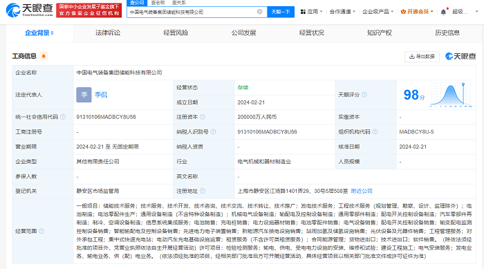据天眼查App查询获悉,中国电气装备集团储能科技有限公司成立,法定代表人为季侃,注册资本20亿人民币,经营范围包括储能技术服务、电池制造、机械电气设备制造、集中式快速充电站等。 股东信息显示,该公司由中国电气装备集团有限公司、宁德时代新能源产业投资有限公司、平高集团有限公司、许继集团有限公司、山东电工电气集团有限公司等8家公司共同持股。 |