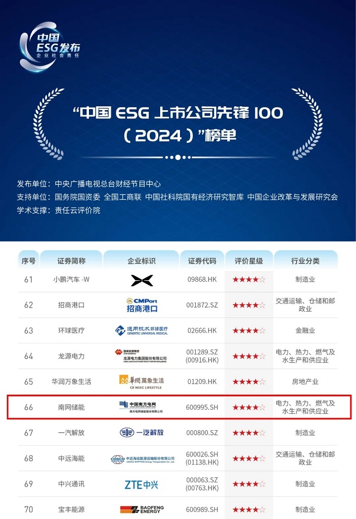 储能中国网获悉,6月30日,由中央广播电视总台财经节目中心联合国务院国资委、全国工商联 、中国社科院国有经济研究智库、中国企业改革与发展研究会发起的《2024年度 ESG 行动报告》发布活动在北京举行。活动发布了2024年“中国ESG上市公司先锋100”榜单,南方电网储能股份有限公司(以下简称“南网储能”)凭借在环境、社会和公司治理等方面的履责成效,从6471家中国上市公司样本池、972家上市公司评价样本中脱颖而出,蝉联“中国ESG上市公司先锋100”榜单,位列第66位,较去年排名提升26位。 过去一年,南网储能始终坚持以习近平新时代中国特色社会主义思想为指导,完整、准确、全面贯彻新发展理念,锚定2025年全面建成世界一流企业目标不动摇,加快推动上市公司ESG工作建设,及时回应市场关切、持续提升价值创造能力,着力推动高质量发展。 在绿色发展方面 2023年南网储能把握“双碳”目标战略机遇,聚力发展抽水蓄能和新型储能两大业务,建成投产我国首个多技术路线锂电池储能电站,新型储能项目储备达800万千瓦;稳步推进 4 个抽水蓄能项目建设,新核准 5 个抽水蓄能项目,新增抽水蓄能签约项目超过 1000 万千瓦。与此同时,为加强抽水蓄能电站建设过程中环境保护和水土保持管理,南网储能在国内首次制定应用了抽水蓄能电站绿色施工管理办法和评价指标。该标准明确了抽水蓄能电站建设期的管理机构和各参建单位绿色施工工作职责及评价标准,对提高我国抽水蓄能电站建设过程中环境保护和水土保持管理水平、开展环境保护和水土保持评估具有重要促进意义。过去一年,南网储能抽水蓄能总体规模创历史新高,有力支撑了新型能源体系建设,年度常规水电、抽水蓄能和新型储能电站的绿色电能发电量为171.6亿千瓦时,相当于减少二氧化碳排放量717.48万吨,相当于节约标煤204.02万吨。公司阳江抽水蓄能电站荣获“国家水土保持示范工程”称号,全年环保总投入达1.676亿元,绿色低碳发展品牌进一步彰显。 在社会责任方面 2023年南网储能严格保障员工权益,真切关怀关爱员工,全年员工培训投入总额1986.1万元,培训覆盖率100%,全年新增就业人数127人,吸纳应届毕业生126人。公司专业技术专家陈满获评南方周末2023“年度科创力人物”,张豪获评南方电网第四届“南网工匠”,刘涛获评中国水力发电工程学会“水电英才奖”,于亚雄获评“中央企业青年岗位能手”。过去一年,南网储能对外捐赠、社会公益捐赠支出193.4万元,员工志愿者人数485人、志愿服务活动时长1600小时。同时,公司积极助力乡村振兴,参与广东“百千万工程”实施,全年投入帮扶资金158.5万元,共结对帮扶6地,实施定点帮扶项目6个,派驻帮扶干部9名。 在公司治理方面 2023年南网储能不断完善以股东大会、党委会、董事会、监事会和经理层“四会一层”为核心的公司法人治理结构,建立健全以公司章程为统领、权责清单为抓手、议事规则等制度促落地的“1+1+N”公司治理制度体系,形成各司其职、各负其责、有效制衡、协调运转的公司治理体系。公司获上交所信息披露工作评价A级(最高级别)。公司董事会建设案例入选中国上市公司协会董事会建设“优秀实践案例”,公司所属检修试验分公司被认定为南方电网公司2023年度公司治理优秀企业。 在科技创新方面 2023年南网储能加快向科技型企业转型,自主研发投运我国首个大规模抽水蓄能人工智能数据分析平台,正式投运国内首个抽水蓄能多厂站集控中心,自主研制的抽水蓄能成套核心控制系统在国内首次实现“芯片级”自主可控,《抽水蓄能多维度智能巡维关键技术》《40万千瓦700米级抽水蓄能机组关键技术与应用》等多项科技成果获得“总体国际领先”评价。配合南方电网公司成功申报新型储能央企创新联合体,参股成立新型储能国家制造业创新中心,入选国家自然科学基金委员会依托单位,参与国际标准化组织(ISO)机械储能技术委员会,公司创新平台建设的格局和影响不断扩大。过去一年,南网储能获评国资委科改企业“标杆”称号,南网储能科研院成功获得国家电化学储能电站安全信息监测平台认证挂牌。公司全年新增专利授权数170项,累计拥有专利授权703项,其中累计发明专利授权340项,PCT累计授权10项。 未来,南网储能将继续以ESG为重要抓手,不断推进公司ESG治理体系建设,开展高质量ESG实践,努力提升ESG治理表现,推动公司在高质量发展、可持续发展的道路上稳步前行,为推进中国式现代化作出新的更大贡献。 |