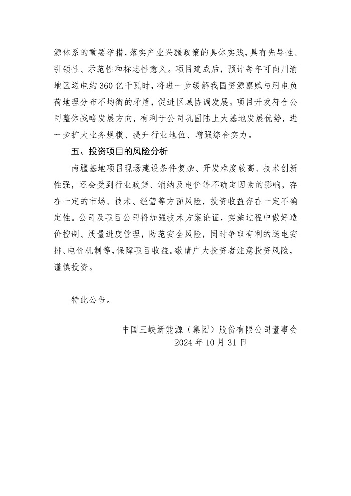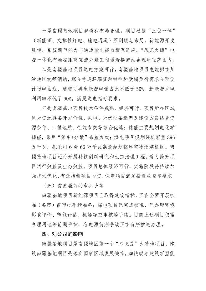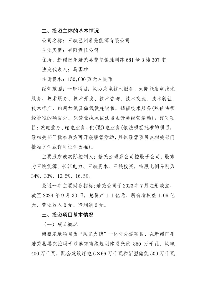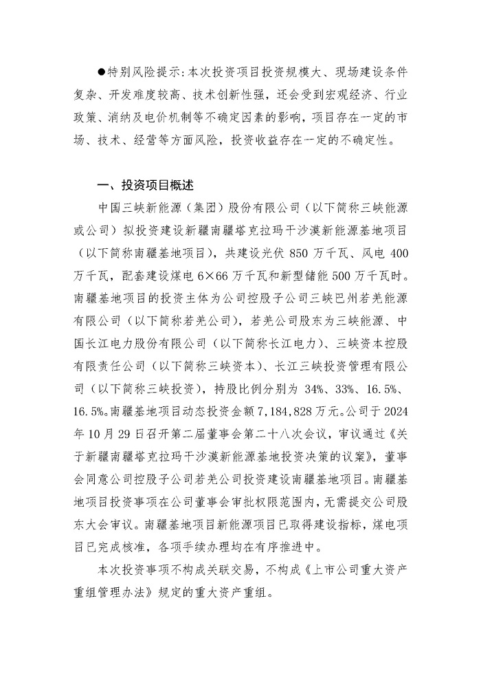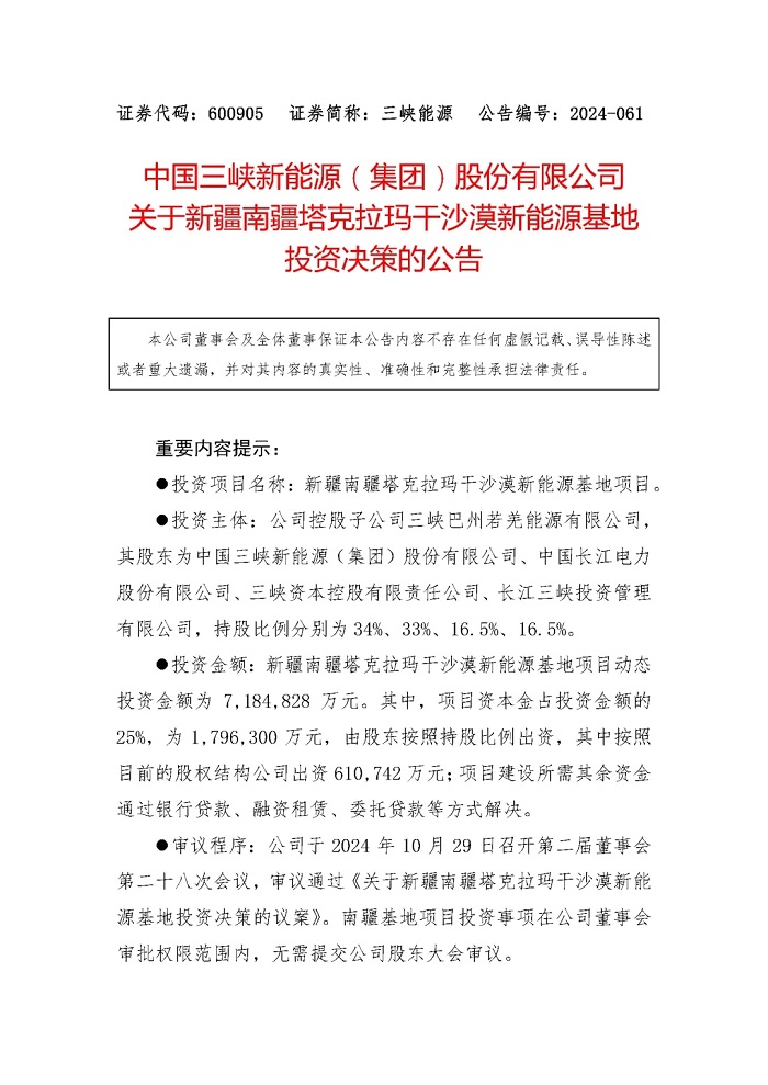 储能中国网获悉,10月31日,三峡新能源发布《中国三峡新能源(集团)股份有限公司关于新疆南疆塔克拉玛干沙漠新能源基地投资决策的公告》。 新疆南疆塔克拉玛干沙漠新能源基地项目共建设光伏850万千瓦、风电400万千瓦,配套建设煤电6×66 万千瓦和新型储能500万千瓦时(5GWh)。所发电力拟依托已纳规的疆电(南疆)送电川渝特高压直流工程外送消纳。 三峡巴州若羌能源有限公司、 中国长江电力股份有限公司、三峡资本控股有限责任公司、长江三峡投资管理有限公司,分别以34%、33%、16.5%、16.5%的持股比例,投资建设新疆南疆塔克拉玛干沙漠新能源基地项目。 新疆南疆塔克拉玛干沙漠新能源基地项目动态投资金额为7,184,828万元。其中,项目资本金占投资金额的25%,为1,796,300万元。 结合国家发改委、能源局关于“沙戈荒”外送基地新能源、支撑调节性电源、输电通道同步建成、同步运营的要求及工作推进情况,预计本基地项目整体工程建设期3-4年,其中新能源与储能项目建设将根据煤电项目、外送通道建设进度适时调整,保障“三位一体”同步建成。 原文如下: