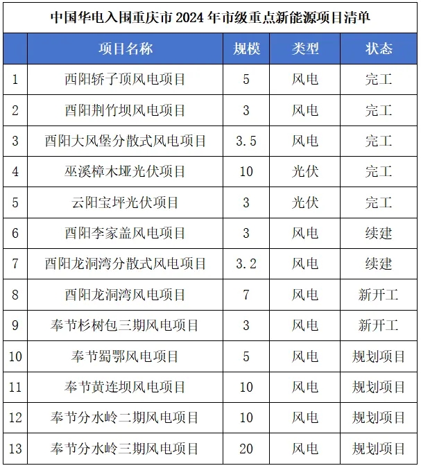 同时,根据重庆发布的《关于做好2024年市级重点项目实施有关工作的通知》,中国华电有13个新能源项目入围2024年重庆市重点项目名单。