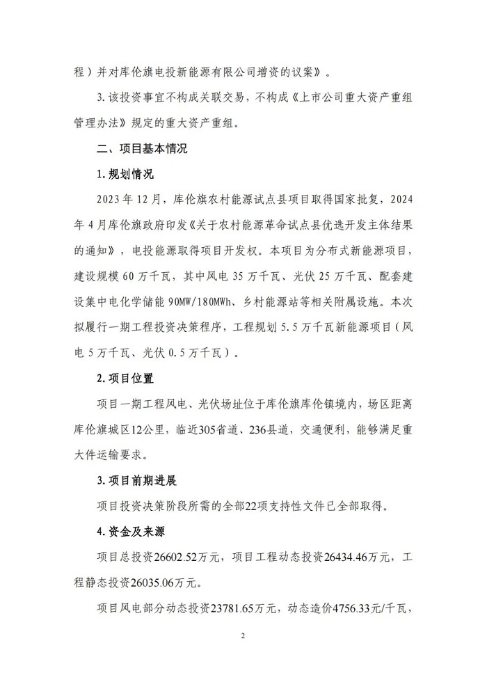 储能中国网获悉,11月29日,内蒙古电投能源股份有限公司发布公告称拟投资建设库伦旗农村能源革命试点县项目(一期工程),并对库伦旗电投新能源有限公司增资。 该项目为分布式新能源项目,项目总投资26602.52万元,建设规模60万千瓦,其中风电35万千瓦、光伏25万千瓦、配套建设集中电化学储能90MW/180MWh、乡村能源站等相关附属设施。 据了解,库伦旗农村能源革命试点县项目(一期工程)由库伦旗电投新能源有限公司直接负责。该公司成立于2024年6月7日,是内蒙古电投能源股份有限公司的全资子公司,此次公告表示拟将该公司注册资本由500万元增加至5300万元。 该项目作为内蒙古自治区唯一国家首批农村能源革命试点县项目,是实现通辽市库伦旗地方低碳转型绿色发展和乡村振兴的重点工程。本次拟履行一期工程投资决策程序,一期工程规划建设5万千瓦风电、0.5万千瓦光伏、1座66千伏升压站、1个乡村能源站,配套建设空气源热泵、新能源充电桩、光伏路灯等项目附属设施。建设于库伦旗库伦镇境内,场区距离库伦旗城区12公里,临近305省道、236县道,交通便利,能够满足重大件运输要求。 原文如下: |