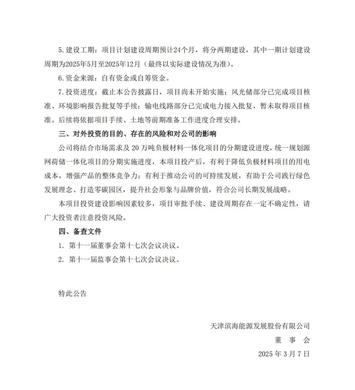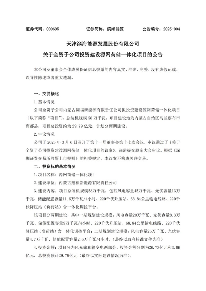 储能中国网获悉,3月7日,天津滨海能源发展股份有限公司(简称:滨海能源)发布关于全资子公司投资建设源网荷储一体化项目的公告。 公告指出,公司全资子公司内蒙古翔福新能源有限责任公司拟投资建设源网荷储一体化项目,总装机规模58万千瓦,项目建设地为内蒙古自治区乌兰察布市商都县,项目总投资约为29.79亿元,计划分两期建设。 项目总装机规模58万千瓦,包括风电容量45万千瓦、光伏容量13万千瓦、储能配置容量11.6万千瓦/4小时、220千伏升压站、68.84公里输电线路、220千伏降压站(负荷站)含一体化调控平台。 该项目分两期建设,其中一期规划建设规模:风电容量20万千瓦、光伏容量8.3万千瓦、储能配置容量9万千瓦/4小时、220千伏升压站、68.84公里输电线路、220千伏降压站(负荷站)含一体化调控平台;二期规划建设规模:风电容量25万千瓦、光伏容量4.7万千瓦、储能配置容量2.6万千瓦/4小时。(最终以政府核准文件为准) 项目分为风光储和输变电两部分,投资金额分别为26.73亿元和3.06亿元,总投资预计29.79亿元(最终以实际建设情况为准)。 公告原文: