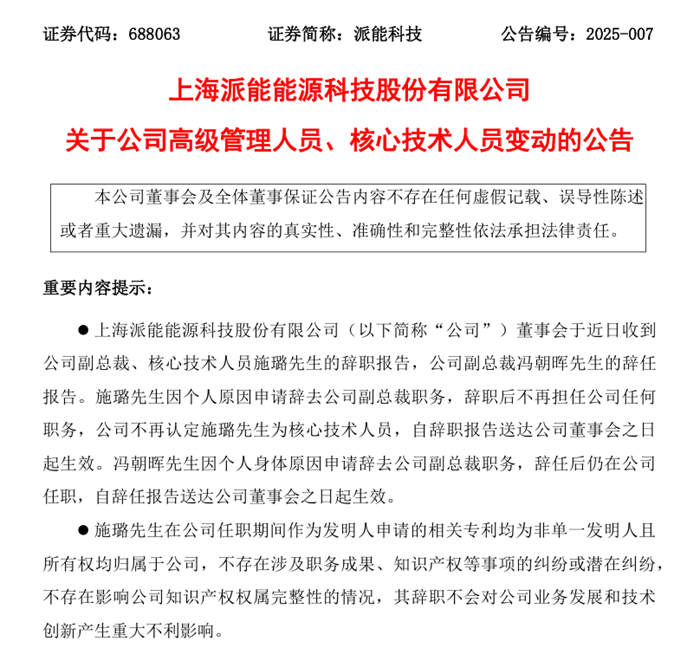 | 储能中国网获悉,近日,派能科技发布公告称,公司董事会于近日收到公司副总裁、核心技术人员施璐先生的辞职报告,公司副总裁冯朝晖先生的辞任报告。 施璐先生因个人原因申请辞去公司副总裁职务,辞职后不再担任公司任何职务,公司不再认定施璐先生为核心技术人员,自辞职报告送达公司董事会之日起生效。 冯朝晖先生因个人身体原因申请辞去公司副总裁职务,辞任后仍在公司任职,自辞任报告送达公司董事会之日起生效。 值得一提的是,2月28日,派能科技宣布聘任蔡雪峰先生为公司副总裁,并决定新增认定蔡雪峰先生为公司核心技术人员。 此次施璐先生离职后,公司核心技术人员由5人变动为4人。本次变动后,公司核心技术人员为蔡雪峰、朱广焱、胡学平、季林锋。 派能科技表示,施璐先生的辞职不会对公司整体研发实力产生重大不利影响,亦不存在对公司业务发展、技术研发、产品创新等产生不利影响的情况。 |