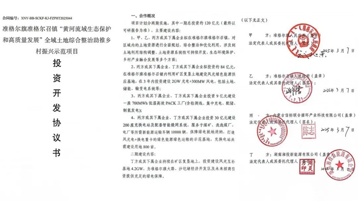 | 储能中国网获悉,3月18日,湖南能源集团所属湖南湘投新能源有限公司(以下简称“湘投新能源”)宣布成功签约内蒙古自治区准格尔旗6.5GW风光新能源项目。 根据准格尔旗政府印发的《准格尔旗新能源矿卡重卡替换燃油矿卡重卡三年行动方案》,到2026年6月,全旗煤矿、洗选煤厂、电厂、集装站等领域的10000辆燃油矿卡、60000辆燃油重卡将由新能源车实现全部替代,经初步测算,仅10000辆新能源重卡一年的耗电量将达42亿度。基于该重大用电需求,本项目拟投资建设2GW光电+300MW风电的风光绿色能源供应基地、一座700MWh的低温高效PACK工厂、200座充换电站及配套智能微网系统,致力于打造风光电+换电重卡矿卡绿色能源绿色运输示范基地。 湘投新能源将将联合信标公司(矿山治理企业)、南方电网(蒙西电网股东)、三一重卡、富能宝公司(技术支持方)等多方共同推进本项目,重点投资建设风光新能源供应基地。同时,基于当地沙圪堵工业园区及大路工业园区等大型工业园区用电需求,在顺利实施风光电+换电重卡矿卡示范项目的基础上,准格尔旗将再支持湘投新能源投资建设4.2GW的风光互补基地。