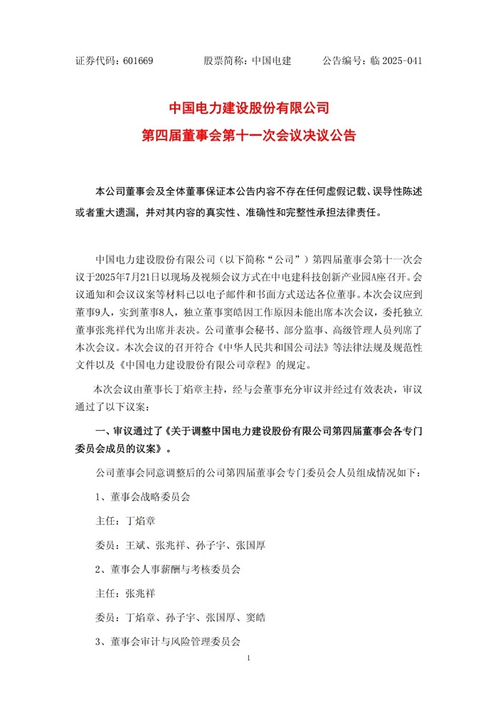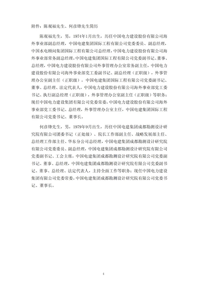 储能中国网获悉,7月23日,中国电力建设股份有限公司(以下简称“中国电建”)发布《第四届董事会第十一次会议决议公告》。 根据公告,中国电建7月21日召开第四届董事会第十一次会议,会议审议通过了《关于聘任中国电力建设股份有限公司副总经理的议案》,公司董事会同意聘任陈观福先生、何彦锋先生为公司副总经理。 陈观福先生简历 陈观福先生,男,1974年1月出生,历任中国电建海外事业部副总经理,中国电建集团国际工程有限公司党委委员、副总经理,中国水电顾问集团国际工程有限公司总经理,中国电建海外事业部常务副总经理,中国电建集团国际工程有限公司党委副书记、董事、总经理,中国电建外事管理办公室常务副主任,中国电建海外事业部党工委副书记、副总经理(正职级),外事管理办公室副主任(正职级),中国电建集团国际工程有限公司党委副书记、董事、总经理、法定代表人,中国电建海外事业部党工委书记、执行副总经理(正职级),外事管理办公室副主任(正职级)等职务;现任中国电力建设集团有限公司党委常委,中国电建海外事业部党工委书记、总经理,外事管理办公室主任,中国电建集团国际工程有限公司党委书记、董事长。 何彦锋先生简历 何彦锋先生,男,1979年9月出生,历任中国电建集团成都勘测设计研究院有限公司团委书记(正处级)、院长工作部副主任、战略发展部主任、总经理工作部主任、华东分公司总经理,中国电建集团成都勘测设计研究院有限公司党委委员、副总经理,中国电建集团成都勘测设计研究院有限公司党委副书记、工会主席,中国电建集团成都勘测设计研究院有限公司党委副书记、董事、总经理,中国电建集团成都勘测设计研究院有限公司党委副书记、董事、总经理、法定代表人,主持全面工作等职务;现任中国电力建设集团有限公司党委常委,中国电建集团成都勘测设计研究院有限公司党委书记、董事长。 公告原文如下: