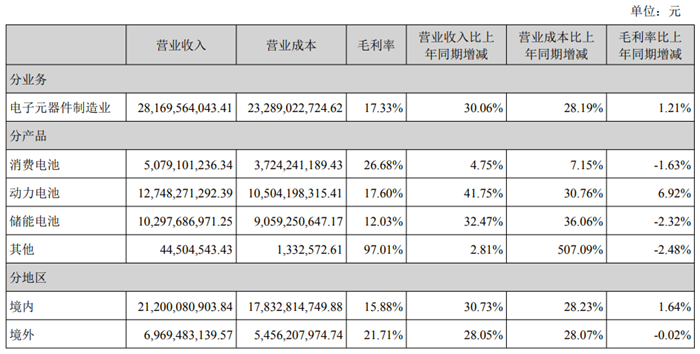 储能中国网获悉,8月21日晚,亿纬锂能发布2025年半年报。上半年公司实现营业收入约282亿元,同比增长30.06%;实现归属于上市公司股东的净利润16.05亿元,同比减少24.9%;实现归属于上市公司股东的扣非净利润11.57亿元,同比减少22.82%。 主营业务方面: 动力电池营收127.48亿元,同比增长41.75%,毛利率17.60%,毛利率同比增长6.92%; 储能电池营收102.98亿元,同比增长32.47%,毛利率12.03%,毛利率同比下降2.32%; 出货量方面,报告期内动力电池出货 21.48GWh,同比增长 58.58%;储能电池出货28.71GWh,同比增长37.02%。 地区划分方面: 境内营收212亿元,同比增长30.73%,毛利率15.88%,毛利率同比增长1.64%; 境外营收69.69亿元,同比增长28.05%,毛利率21.71%,毛利率同比下降0.02%; 国内及海外旺盛的装机需求推动储能电池出货快速增长在全球向低碳经济转型的背景下,中国“双碳”战略、欧盟“绿色协议”等政策和激励措施,推动了储能系统在多领域的部署,扩大了市场并巩固了锂离子电池在储能行业的主导地位。 2025 年上半年,全球储能需求高增,市场呈现“核心市场提质、新兴区域放量”的双轮驱动特征。 中国方面,根据CNESA 数据,1-6 月新型储能装机达 42.61GWh,同比增长 27.5%,主要受新能源全面入市、531 并网节点及容量补偿政策驱动。伴随中国这个全球最大储能市场走向价值创造新阶段,优质产能及产品的企业将拥有更多竞争优势,占据更大市场份额。 另外,海外市场需求强劲,呈现多点开花态势。美国市场储能需求依然强劲,预计全年储能累计装机规模将达 49GWh。欧洲市场以补贴激励储能发展,储能总体需求进一步提升。亚洲、中东等新兴市场大容量招标项目持续推出,推动储能行业需求爆发。 公司坚持为客户创造效益及价值,与国内外一线能源企业达成战略合作,加速创新技术落地与全球市场开拓。在技术创新叠加电力市场改革的背景下,储能行业将从“规模扩张”转向“价值深耕”,伴随行业500Ah+超大电芯落地应用,新一代 6MWh+储能系统集成度大幅提升,结合智能电力交易决策,为储能创造更大经济价值,优质、安全储能产品将获取更多市场。公司为创新赋能,率先量产 600Ah+电芯,利用全场景解决方案驱动储能价值跃升。 |