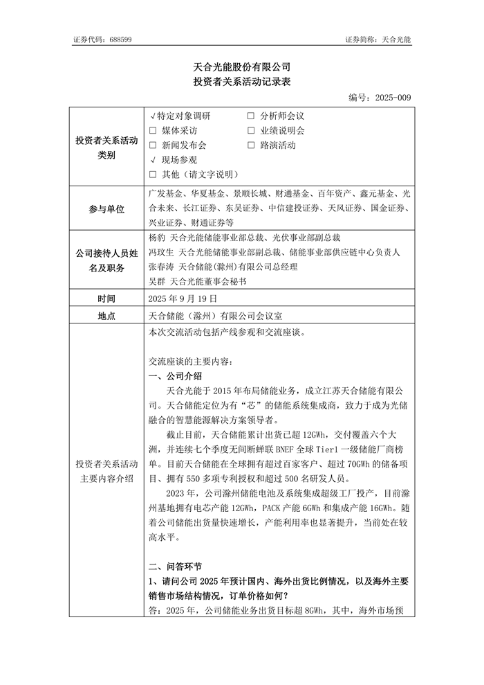 储能中国网获悉,9月22日,天合光能发布2025年9月19日投资者关系活动记录。其中,公司接待人员姓名及职务显示,杨豹已升任天合光能储能事业部总裁、光伏事业部副总裁。另外,目前担任天合光能储能事业部副总裁及储能事业部供应链中心的负责人为冯玟生。张春涛,任天合储能(滁州)有限公司总经理。 杨豹负责天合储能全业务线 据悉,杨豹此前职务包括了天合光能全球营销总裁、兼中国区负责人。其本人的职务提升变动,就在近期。他本人负责天合储能整个事业部的管理。由于出色的储能市场营销能力,促进了天合在这个新兴行业中的发展,因此这可能是其职务得到提升的重要因素之一。 杨豹在2013年,就已经入职天合光能。此前他也有过多家企业的工作经历:曾在晶澳科技、天华阳光等作为职业经理人出现。 其在天华阳光曾担任供应链管理副总裁兼中国区总裁,负责过组件供应网络、战略合作伙伴及中国电站项目开发。在欧贝黎新能源科技股份有限公司也担任过运营副总裁。他本人获得了中国人民大学MBA学位。 2024年左右,天合光能进行了组织架构的全面调整,目前分为四个主要业务:光伏产品(含组件业务)、储能业务、系统解决方案(如支架、分布式系统即天合富家等、集中式电站、其他)、数字能源业务(新能源运维)、新能源发电以及其他。 2024年,天合储能板块营收为23.35亿,同比上年增长19.1%,毛利率为近13%。另一板块数字能源服务的营收为19.63亿,同比营收增幅近100%。这两个板块营收增幅较快。组件所在的光伏产品营收依然是最高的,达557亿;系统解决方案营收为188亿,毛利率为18.4个百分点。 附:天合光能:2025年9月19日投资者关系活动记录表