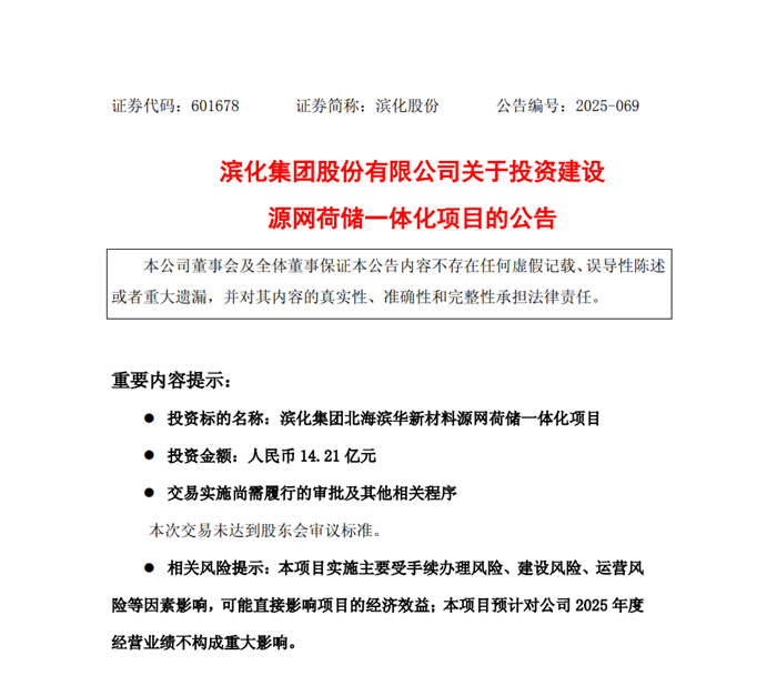 储能中国网获悉,10月1日,滨化集团股份有限公司(滨化股份,601678.SH)发布公告,拟通过全资控股的山东滨化新能源有限公司,投资建设滨化集团北海滨华新材料源网荷储一体化项目,总投资约14.21亿元。 该项目位于山东省滨州市北海经开区及无棣县境内,建设内容包括160MW风电、100MW光伏电站,130MW/260MWh储能装置以及110kV升压站(包含智慧能源综合调度管控中心等),风光年均利用小时数分别为2332.4h、1338.5h。 根据公告,该项目拟于2025年11月30日开工,建设周期为2年。基于自发自用电量4.24亿千瓦时/年,自发自用含税电价423.7元/MWh,余电收益2048.73万元/年进行经济效益分析测算,项目投资回收期为12.06年(所得税后),项目投资财务内部收益率7.47%,项目资本金财务内部收益率17.31%,投产后预计年均净利润约5,035.47万元。 项目建成后,所发电力主要在滨化股份子公司山东滨华新材料有限公司、滨州蓝润环境资源有限公司负荷端消纳。电源端包含国网供电和新能源供电两部分,其中新能源供电端由160MW风电和100MW光伏组成,年均可对负荷端实现绿电直供4.24亿度,新能源电量在总用电量占比(负荷用电量)63%左右。余电参与电力市场交易。 按照山东省发改委、省能源局《关于印发源网荷储一体化试点实施细则的通知》(鲁发改能源〔2025〕155号),就地就近消纳模式的源网荷储一体化项目应建设源网荷储一体化管控平台,并可以作为整体参与电力市场交易。项目通过自发自用+余电上网的模式保障项目收益,具有较好的市场前景。 公告称,公司成立了新能源事业部,结合新能源项目自身特点,通过“外部合作+内部迭代”,已经培养起一支成熟的新能源开发团队,建立了适应“源网荷储”一体化项目发展要求的管理体系。公司依托现有资源及外部合作,开发设计了基于项目用电负荷特性的综合能源调控平台,风电、光伏、储能等设备均可采用市场成熟设备。 项目充分结合电源规模和出力特性、汇集条件和送出能力、负荷特性和消纳空间等,优化确定各类电力要素规模与配比,同步建设相应统计体系,对各要素的负荷、电量等进行计量统计,并传输至省调中心,进而保证项目建设符合相应政策、法规,实现源网荷储一体化项目开发实施的示范性作用。 滨化股份表示,将利用项目地广阔的土地资源及丰富的风、光资源,实现风光新能源的就地就近消纳,构建多元化、智慧化的能源供给消纳体系,打造“新能源+化工”耦合发展样板,同时加快自身绿色低碳转型发展。 滨化集团始建于1968年,现已成为主业突出、产业链完整的综合型化工企业集团,拥有氯碱、石化、新能源、新材料和特种化学品五大发展板块。滨化股份于2010年2月在上交所成功挂牌上市,目前拟发行境外上市股份(H股)并申请在香港联交所主板挂牌上市。 来源:滨化股份 |
