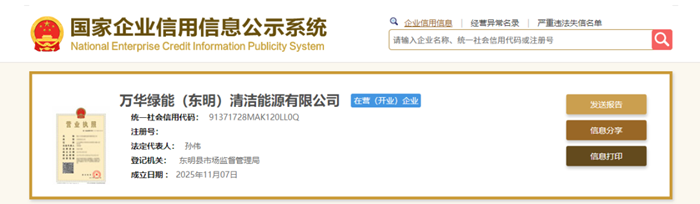 国家企业信用信息公示系统显示,11月7日,万华绿能(东明)清洁能源有限公司成立,注册资本7.2亿元,法定代表人孙伟。