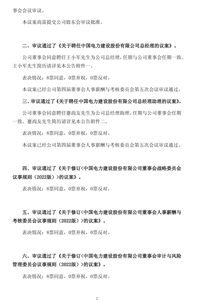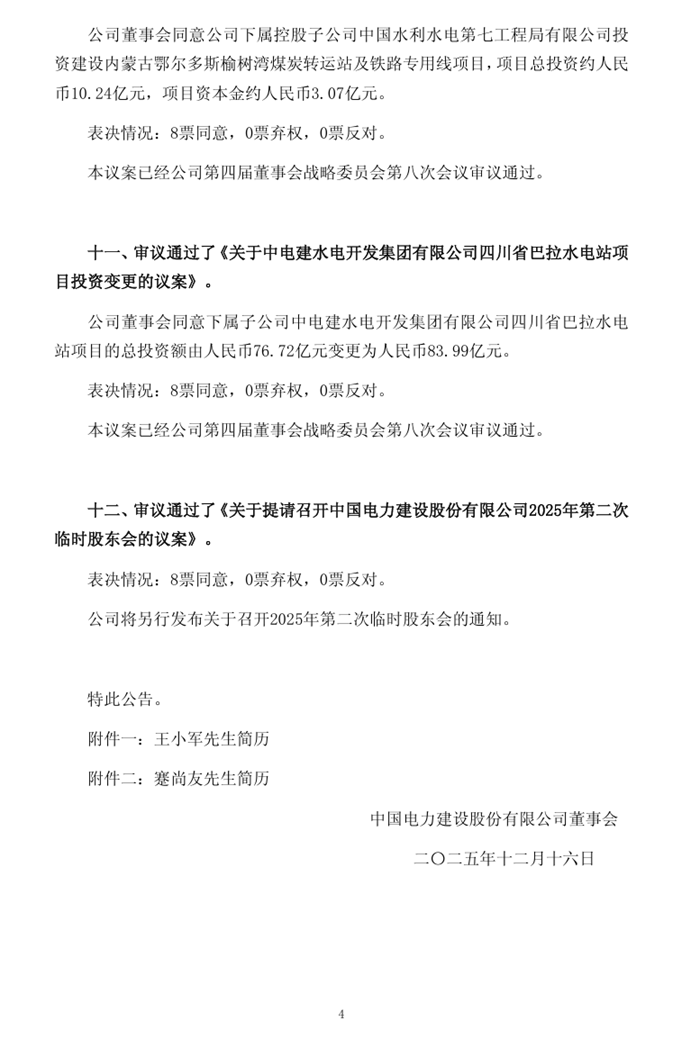 储能中国网获悉,12月16日,中国电建发布公告称,公司第四届董事会第十五次会议于12月15日召开。会议审议通过了《关于确定中国电力建设股份有限公司第四届董事会董事候选人的议案》。经公司控股股东中国电力建设集团有限公司提名、公司董事会人事薪酬与考核委员会审核,公司董事会同意推举王小军先生为公司第四届董事会董事候选人,任期与第四届董事会其他董事任期一致。 会议审议通过了《关于聘任中国电力建设股份有限公司总经理的议案》。公司董事会同意聘任王小军先生为公司总经理,任期与公司董事会任期一致。 会议审议通过了《关于聘任中国电力建设股份有限公司总经理助理的议案》。公司董事会同意聘任蹇尚友先生为公司总经理助理,任期与公司董事会任期一致。 王小军简历: 王小军,男,1971年8月出生,历任中国电建集团华东勘测设计研究院有限公司海外事业发展部副主任、采购与现场管理业务部经理、设备成套项目部副主任,海外事业管理部副主任,土耳其Bure、Feke1、Feke2设备成套项目经理、总工程师,办公室主任;中国电建集团华东勘测设计研究院有限公司副总经理;中国电建集团华东勘测设计研究院有限公司党委书记、副总经理;中国电建集团华东勘测设计研究院有限公司党委副书记、董事、总经理;中国电力建设集团有限公司华东区域总部总经理、党工委副书记;中国电力建设集团(股份)有限公司党委委员;中国电力建设集团有限公司华东区域总部总经理、党工委副书记;中国电力建设集团有限公司党委常委;中国电力建设集团有限公司华东区域总部总经理、党工委副书记;中国电力建设集团有限公司党委常委;中国电力建设股份有限公司党委常委、副总经理;现任中国电力建设集团有限公司党委副书记、董事、总经理。 原文如下: |