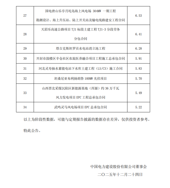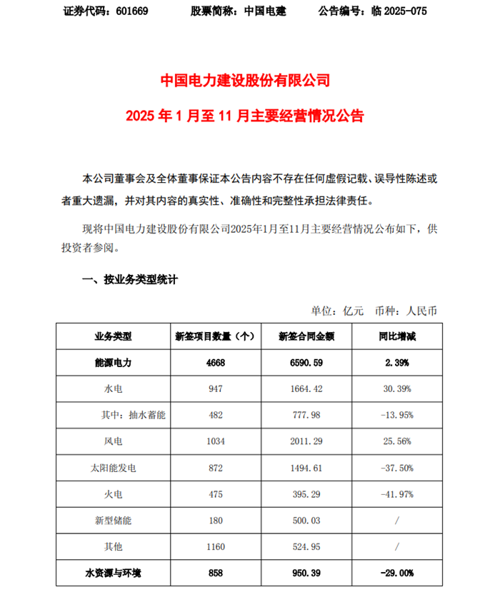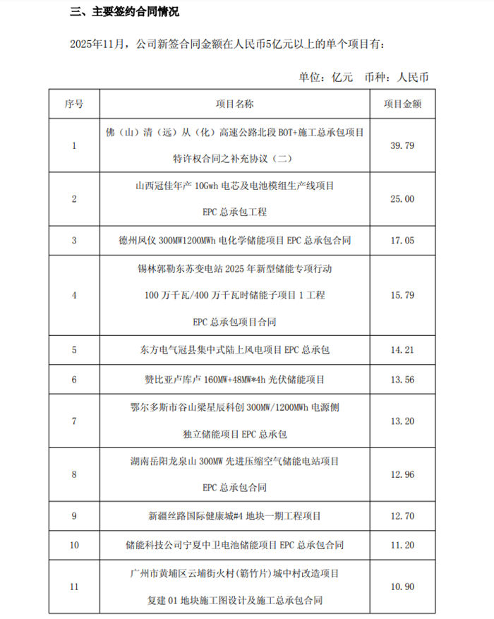 储能中国网获悉,12月24日,中国电建披露公司2025年1月至11月主要经营情况,从业务类型看,其主要分布在能源电力、水资源与环境、城市建设与基础设施等领域,所有业务下新签项目数量为7382个,新签合同金额达10317.55亿元。其中,新型储能新签项目数量180个,新签合同金额500.03亿元。 从项目情况,金额5亿元以上的储能项目7个,总规模达2.87GW/10.332GWh, ◇德州凤仪300MW/1200MWh电化学储能项目EPC总承包,项目金额17.05亿元; ◇锡林郭勒东苏变电站2025年新型储能专项行动100万千瓦/400万千瓦时储能子项目1工程EPC总承包项目,项目金额15.79亿元; ◇赞比亚卢库卢160MW+48MW*4h光伏储能项目,总金额13.56亿元; ◇鄂尔多斯市谷山梁星辰科创300MW/1200MWh电源侧独立储能项目EPC总承包,项目金额13.20亿元; ◇湖南岳阳龙泉山300MW先进压缩空气储能电站项目EPC总承包,项目金额12.96亿元; ◇储能科技公司宁夏中卫电池储能项目EPC总承包,项目金额11.2亿元; ◇义马市电网侧储能200MW/800MMWh储能电站EPC总承包,项目金额8亿元。 公告原文如下: