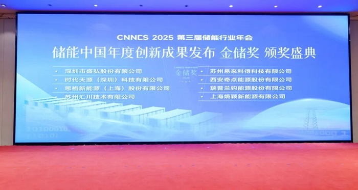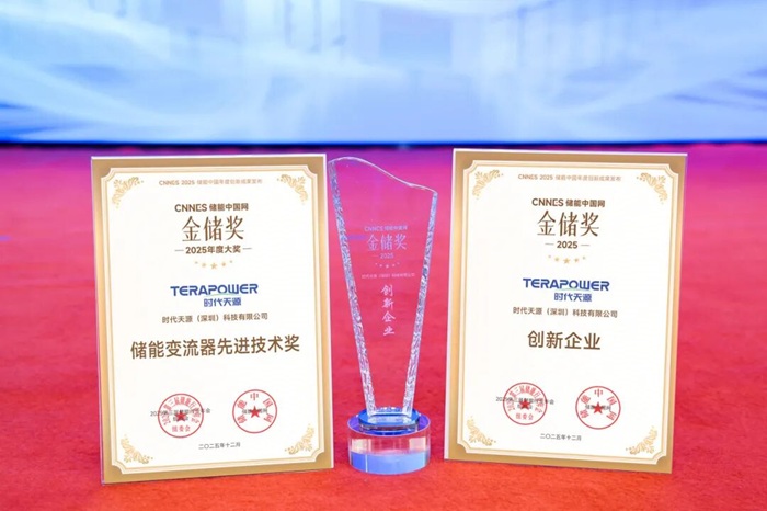 在会议同期举行的储能中国年度创新成果发布暨“金储奖”颁奖盛典中,时代天源凭借在储能领域卓越的创新实力和行业影响力,荣获“创新企业”、“储能变流器先进技术奖 ”两项荣誉大奖。 据了解,“金储奖”是储能行业内的公益评选奖项,根据产品创新、技术应用、品牌影响、行业贡献、社会责任等标准评定获奖名单,重点表彰在国内外具有强大知名度和影响力,业绩行业领先,并具备国际市场开拓能力的储能企业。时代天源此次获奖,标志着公司在储能变流器领域的技术实力与创新成果获得行业的高度认可。 ·