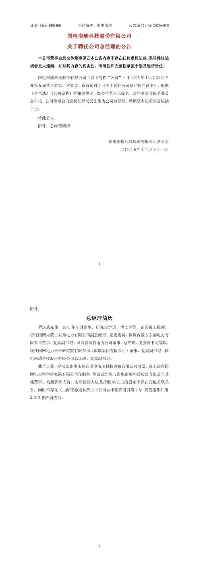 储能中国网获悉,据上国电南瑞公告,国电南瑞科技股份有限公司于2025年12月30日召开第九届董事会第十次会议,审议通过了《关于聘任公司总经理的议案》。根据《公司法》《公司章程》等相关规定,经公司董事长提名,公司董事会提名委员会审核,公司董事会同意聘任罗汉武先生为公司总经理,聘期至本届董事会届满日止。 罗汉武,1975年9月出生,研究生学历,博士学位,正高级工程师。历任国网内蒙古东部电力有限公司副总经理、党委委员,国网内蒙古东部电力有限公司董事、党委副书记,国网青海省电力公司董事、总经理、党委副书记等职。现任国网电力科学研究院有限公司(南瑞集团有限公司)董事、党委副书记,国电南瑞科技股份有限公司总经理、党委副书记。 公告原文如下: