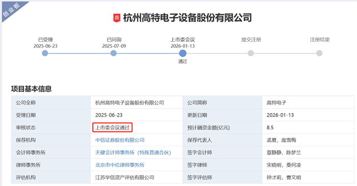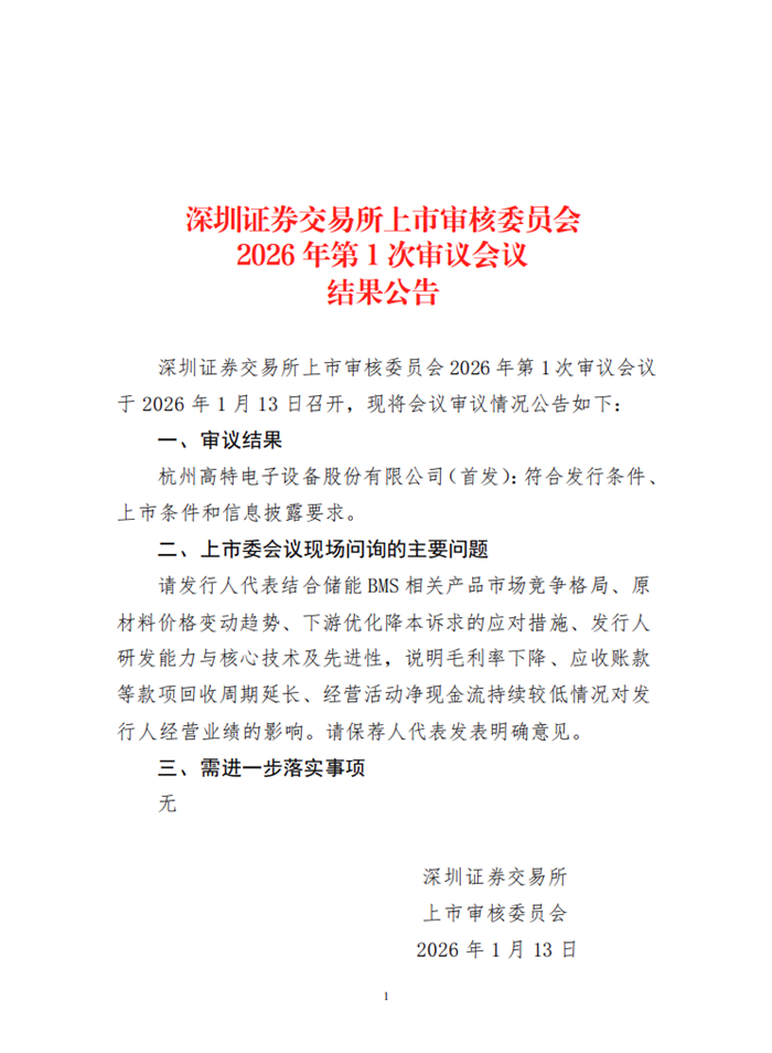 储能中国网获悉,2026年1月13日,深圳证券交易所上市审核委员会召开2026年第1次审议会议对高特电子首发过会审议。审议结果表示,杭州高特电子设备股份有限公司(首发):符合发行条件、上市条件和信息披露要求。目前项目已进入提交注册阶段。 据深交所发行上市审核信息公开平台显示,高特电子IPO申请于2025年6月23日正式受理,同年7月9日进入问询阶段,最终于2026年1月13日正式通过深交所上市委审议会议,成为近两年上市进展最快的储能企业。未来,待高特电子正式登陆深交所创业板,也将进一步巩固其在储能BMS领域的市场地位。 目前,国内储能BMS市场以第三方专业BMS厂商为主,行业竞争也较为激烈,其中专注于BMS技术研发的高特电子一直走在行业前列,不仅率先推动了BMS从被动均衡向主动均衡转变,还推动关键芯片的国产化替代。企业通过模块化设计、高精度算法、电池状态诊断、电池安全及热管理、双向主动均衡、智慧运维服务等构建差异化技术性能优势,并通过关键材料国产化替代、规模化生产等方式打造低成本、高可靠性等竞争优势。另外聚焦储能安全防御,高特电子还推出储能数据溯源与录波装置,作为储能“黑匣子”有效助力储能系统事故溯源与定责。 值得注意的是,依托BMS在储能系统中数据采集与聚合的特性,高特电子还研发了融合微网负荷、储能、光伏、充电桩等数据,实现微网设备监控和故障诊断、能量管理等功能的一体化集控单元及数据服务,构建“BMS+纵向一体化产业生态”。 自2021年启动“BMS+数据服务”业务布局,高特电子已开发了具有强大数据接入和处理能力的一体化集控单元产品,并提供相关数据服务。经过三年多的研发与市场推广,高特电子的一体化集控单元产品及数据服务已广泛应用于多个工商业储能和微电网管理项目,截至2025年9月末汇聚接入的微网站点数量超过3000余个,已初步具备通过数据服务参与虚拟电厂和电力市场化交易的能力。 高特电子表示,未来,公司将凭借在储能BMS领域的技术优势和积累的丰富数据,持续加大一体化集控单元及数据服务的功能范围和推广力度,努力打造业绩增长第二曲线。 根据高特电子招股书披露,在2022年、2023年、2024年及2025上半年期间,公司总营收分别为3.46亿元、7.79亿元、9.19亿元、5.07亿元,销售收入占比逐年增加。对应的报告期内,高特电子净利润分别为5,375.26万元、8,822.92万元、9,842.23万元、5,141.80万元,主营业务毛利率分别高达28.37%、26.53%、26.02%及22.02%。 高特电子曾在招股书表示,2023年、2024年企业产能利用率均超过100%。而随着下游客户需求的不断扩大,现有生产场地及设备产能已无法满足业务扩张需求。而此次上市的募投计划,正是对企业现有主营产品的产能规模扩建。 高特电子本次发行募集资金扣除发行费用后的净额,拟全部用于“储能电池管理系统智能制造中心建设项目”及“补充流动资金”。 “储能电池管理系统智能制造中心建设项目”总投资67413.83万元,其中计划使用募集资金6亿元,建设期拟定为3年,通过扩建产品自动化产线、自建SMT生产线,提升产品产能规模、突破产能瓶颈的同时,逐步减少委外加工的规模及占比,增强产品规模化、低成本竞争优势,持续巩固公司在新型储能BMS行业的领先市场地位。 来源:深交所等 |