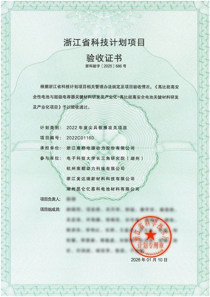 储能中国网获悉,日前,南都电源承担的浙江省“领雁”研发攻关计划项目“高比能高安全性电池关键材料研发及产业化项目”(项目编号:2022C01160)顺利通过验收评审。