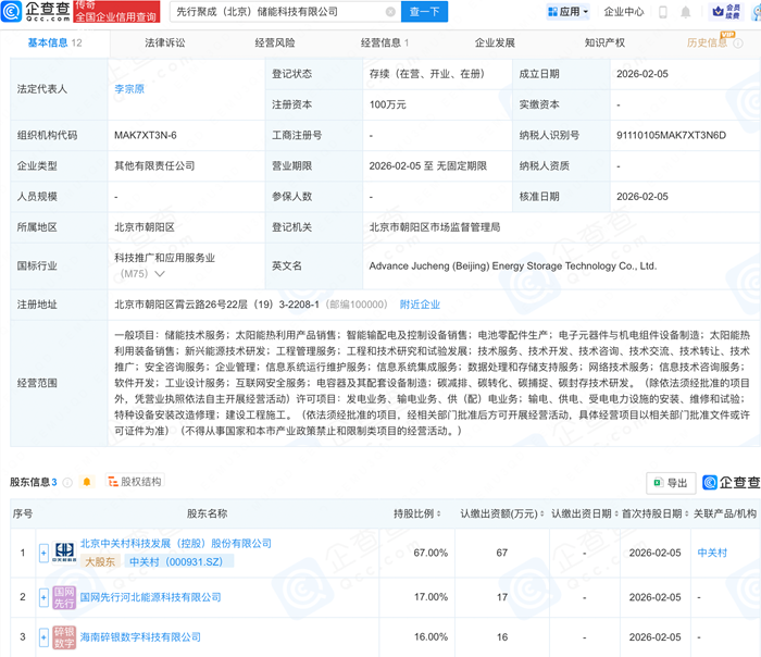 储能中国网获悉,企查查APP显示,近日,先行聚成(北京)储能(885921)科技有限公司成立,经营范围包含:储能(885921)技术服务;太阳能热利用产品销售;智能输配电及控制设备销售;电池零配件生产等。企查查股权穿透显示,该公司由中关村(000931.SZ)等共同持股。