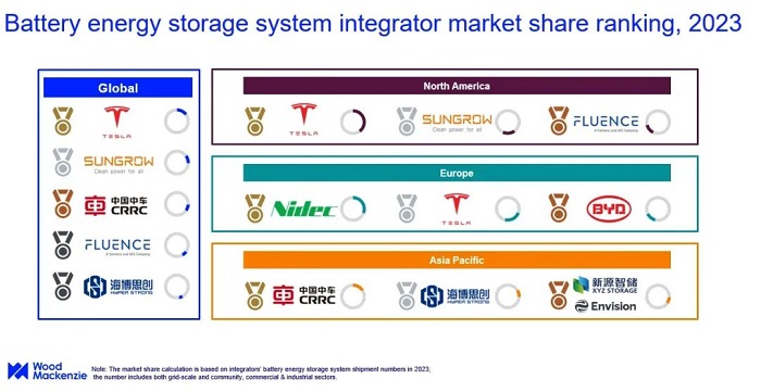 储能中国网获悉,近日,全球知名咨询机构Wood Mackenzie发布了《2025年全球电池储能系统集成商排名报告》,报告反映了日益激烈的区域竞争和不断变化的市场动态。 根据报告,特斯拉在2024年以15%的市场份额连续第二年保持其在电池储能系统集成商市场的领先地位,蝉联榜首。 阳光电源以14%的市场份额位居第二,中车株洲所(CRRC)以8%的市场份额连续第二年位居第三。远景、华为、海博思创位列其后,占比分别为6%、6%、5%。 与2023年相比,特斯拉、阳光电源、中车株洲所继续巩固Top3的位置,远景和华为冲进2024全球Top5,Fluence落榜。值得一提的是,2024年前三排名虽未发生变化,但阳光电源将特斯拉的领先优势从2023年的4个百分点缩小至2024年的仅1个百分点,大幅缩减了差距。 在行业集中度提升、竞争白热化的形势下,阳光电源、远景、华为也是2024年全球Top10中仅有的三家实现市场份额逆势增长的企业。 图为2024年排名 图为2023年排名 报告同时指出市场动态中显著的地区差异。中国储能系统集成商的欧洲市场份额同比飙升67%,目前欧洲前十名企业中有四家中国企业。相反,中国企业在北美的市场份额下降了30%以上,从23%降至16%,这主要是由于中美地缘政治紧张局势升级和美国贸易保护主义加剧。 具体来看,在北美,特斯拉连续第三年保持榜首地位,占据了39%的市场份额,并拉开了与竞争对手的距离。阳光电源保住了第二名的位置,但在2024年其市场份额从17%降至10%。Powin位居北美市场第三。北美市场集中度降低,前五名企业合计份额下降了17个百分点,降至73%。 欧洲市场与北美形成鲜明对比。中国企业中,阳光电源份额激增的尤为突出,其市场份额同比增长67%。阳光电源以21%的份额(2023年为10%)引领市场。前三大公司还包括Nidec和特斯拉。欧洲市场日益分散,前五名玩家占据了70%的市场份额,比上年下降了16个百分点。 在亚洲,中车株洲所(CRRC)保持其领先地位,而阳光电源则从第四名跃升至第二名。远景能源(Envision)位列第三。中国企业巩固了其在整个地区的统治地位,占据了超过90%的总市场份额。 除此之外,中东已成为一个重要的机遇市场,中国集成商阳光电源、比亚迪和华为主导着这个新兴市场。在脱碳目标和不断增长的电力需求推动下,预计到2034年,该地区将安装31GW/115 GWh的储能容量。 目前,全球前10大储能系统集成商中现在有7家中国企业,这反映了中国在该领域日益增长的影响力。然而,激烈的国内竞争迫使中国企业积极向海外市场扩张,特别是欧洲和中东。 “全球BESS集成商的格局正变得越来越复杂,区域贸易政策和地缘政治紧张局势正在重塑竞争态势,” 伍德麦肯兹首席研究分析师Kevin Shang表示,“虽然特斯拉保持着全球领导地位,但中国集成商在欧洲的迅速崛起以及他们在中东等新兴市场的主导地位,标志着行业的根本性转变。成功将越来越取决于公司能否驾驭多元化的监管环境、适应当地市场需求并在多个地区保持具有竞争力的成本结构。” |