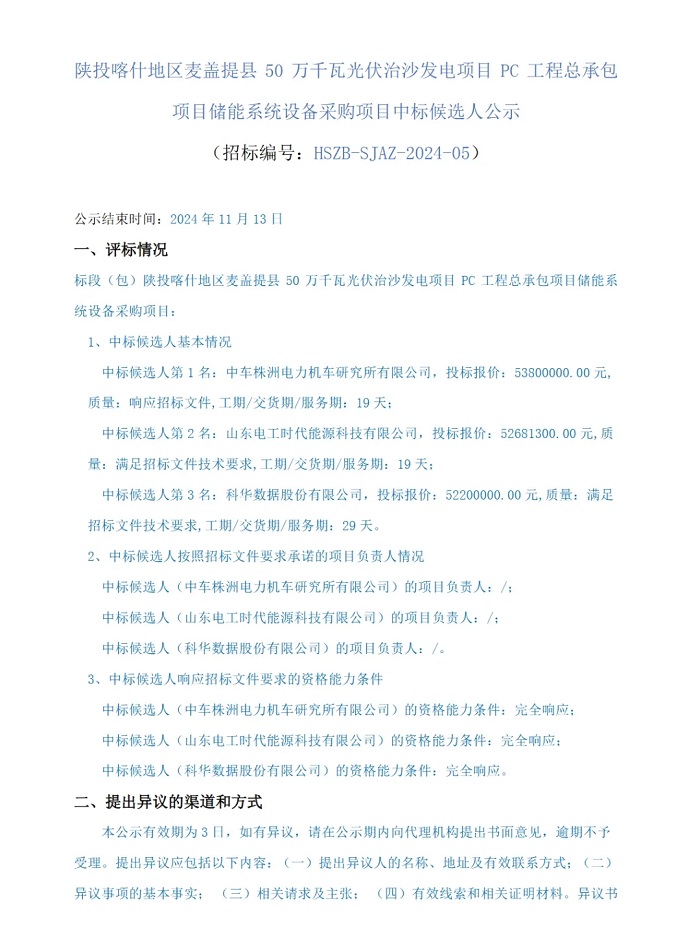 储能中国网获悉,11月1日,陕投喀什地区麦盖提县50万千瓦光伏治沙发电项目储能系统设备采购中标候选人公示,储能规模50MW/100MWh。中车株洲所以单价0.538元/Wh预中标。 根据招标公告,本项目新建一座配套储能电站。总装机容量为50MW/100MWh,放电倍率为0.5C,共设置20个储能电池舱,10个变流升压一体机舱。储能场区的电能经过变流升压一体机升压至35kV之后以两回集电线路接入升压站35kV配电装置室。 中标候选人情况如下: 第一中标候选人:中车株洲电力机车研究所有限公司,投标报价5380万元,折合单价0.538元/Wh; 第二中标候选人:山东电工时代能源科技有限公司,投标报价5268.13万元,折合单价0.527元/Wh; 第三中标候选人:科华数据股份有限公司,投标报价5220万元,折合单价0.522元/Wh。 中标候选人公告原文如下:
