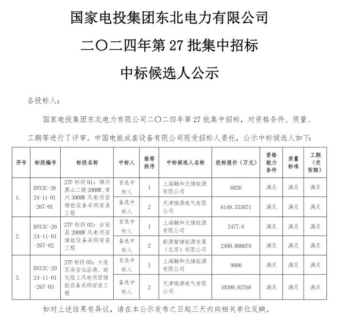 储能中国网获悉,近日,国家电投集团东北电力有限公司二〇二四年第27批集中招标中标候选人公示。融和元储预中标国家电投辽宁4个风电项目共配套120MW/340MWh储能系统采购。 2小时储能系统中标候选人报价范围0.603-0.62元/Wh;4小时储能系统中标候选人报价0.49-0.52元/Wh, 具体如下: 辽宁锦州黑山二期200MW、常兴300MW风电项目,共配套50MW/100MWh储能设备采购 第一中标候选人:融和元储,投标报价6026万元,折合单价0.603元/Wh; 第二中标候选人:瑞源电气,投标报价6149.553071万元,折合单价0.615元/Wh。 辽宁台安县200MW集中式风电项目,配套20MW/40MWh储能设备采购 第一中标候选人:融和元储,投标报价2477.6万元,折合单价0.619元/Wh; 第二中标候选人:新源智储,投标报价2480.000079万元,折合单价0.62元/Wh。 辽宁大连瓦房店仙浴湾、谢屯陆上风电项目,配套50MW/200MWh储能设备采购 第一中标候选人:融和元储,投标报价9800万元,折合单价0.49元/Wh; 第二中标候选人:瑞源电气,投标报价10399.02768万元,折合单价0.52元/Wh。 中标候选人公示原文如下: