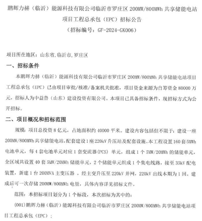 储能中国网获悉,12月16日,鹏辉力赫再发大规模储能项目EPC招标。此次项目为位于山东临沂市罗庄区200MW/800MWh共享储能电站项目,项目资金来源为白筹资金80000万元,要求建设一座共享储能电站,配套建设1座220kV升压站及配套设施。 本工程设置160套5MWh电池单元,每4套电池单元对应1套变流器(PCS)单元,组成1个5MW/20MWh的储能单元,全区域共设置40套5MW/20MWh储能单元,2个储能单元组成1个集电线路,接至35kV配电装置,新建1台200NIVA主变压器,经主变升压至220kV并网,220kV出线本期为1回。 该项目不允许联合体投标。 原文如下: