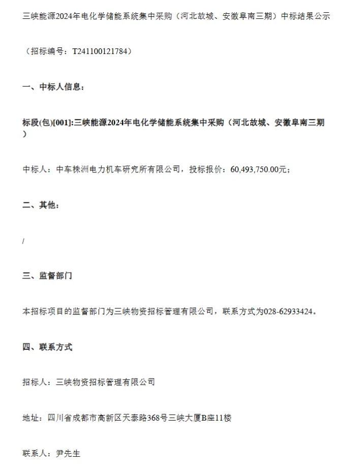 储能中国网获悉,2月5日,三峡能源2024年电化学储能系统集中采购(河北故城、安徽阜南三期)中标结果公示。 中标结果显示,中车株洲电力机车研究所有限公司以6049.375万元中标该项目,折合单价0.479元/Wh。 据此前发布的中标候选人公示,项目第二中标候选人为楚能新能源股份有限公司,投标报价6244.375万元,折合单价0.495元/Wh;第三中标候选人为许昌许继电科储能技术有限公司,投标报价6312.217万元,折合单价0.5元/Wh。 项目招标人为三峡物资招标管理有限公司,本次招标采购项目为三峡能源河北故城、安徽阜南三期项目2个电化学储能系统设备,各项目具体情况如下: 三峡能源河北故城项目: 三峡能源河北故城县50MW风电项目位于故城县西南部西半屯镇和建国镇,海拔高度在30m~50m之间,场址中心距离故城县约21km,距离衡水市约64km。项目规划装机容量50MW,设计安装8台单机容量为6250kW的风电机组。风电机组通过箱变升压至35kV,然后通过2回35kV电缆连接至35kV架空线路送至35kV开关站。风电场拟配套建设一座35kV开关站,配置7.5MW/15MWh储能电池,本项目为三峡能源河北故城县50MW风电项目配储项目。 三峡能源安徽阜南储能电站三期: 三峡能源安徽阜南储能电站三期项目位于安徽省阜阳市阜南县中岗镇新建村,距离阜阳市约27km,距离阜南县城约13km,站址区域地势平坦开阔,站址邻近Y047乡道,交通便利,进出线方便。 项目建设55.625MW/111.25MWh电化学储能电站,采用磷酸铁锂电池系统,拟在三峡阜阳市阜南县储能电站预留场地建设(三峡阜南储能电站一期已建设300MW/600MWh的电化学储能电站、二期正建设39.8MW/79.6MWh的电化学储能电站),本项目为三峡能源安徽北控蒙城县陈桥二期100MW风电项目配储项目。 公告如下: