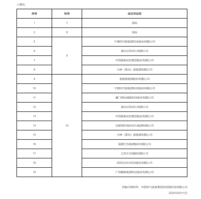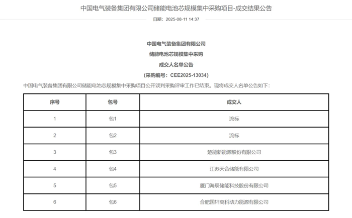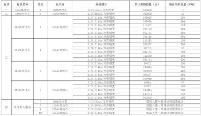 | 储能中国网获悉,8月11日,中国电气装备集团有限公司公布储能电池芯规模集中采购项目成交结果公告。其中,成交名单公告显示, 标包1:流标,50Ah,规模16MWh; 标包2:流标,100Ah,规模32MWh; 标包3:成交人,楚能新能源,314Ah,规模2920MWh; 标包4:成交人,天合储能,314Ah,规模2180MWh; 标包5:成交人,海辰储能,314Ah,规模1400MWh; 标包6:成交人,国轩高科,314Ah,规模700MWh; 另外,四个标包为框架入围包(未明确具体采购规模)。 其中:标包7、标包8流标; 标包9:宁德时代、亿纬动力、中创新航、力神4家供应商入围; 标包10:楚能新能源、宁德时代、亿纬动力、中创新航、国轩高科、力神、瑞浦兰钧、天合储能、欣旺达动力、鹏辉能源等11家供应商入围。 根据中国电气装备集团有限公司发布储能电池芯规模集中采购项目采购公告。本次共采购涉及4个标段,包括50Ah、100Ah、280Ah、314Ah磷酸铁锂电池芯方形铝壳产品。其中,标段一、二、三预计采购数量为736.5604万支电芯,预计采购容量为7248MWh;标段四为电池芯入围包,采购50Ah电池芯、100Ah电池芯、280Ah电池芯、314Ah电池芯,采用框架入围+邀请谈判或询比价方式。