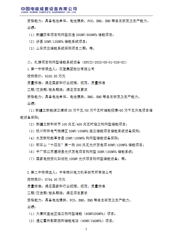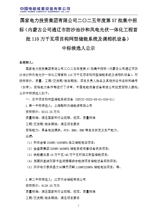 根据招标公告,通辽市防沙治沙和风电光伏一体化工程首批1.1GW项目分为扎鲁特旗防沙治沙和风电光伏一体化工程首批550MW和科左中旗防沙治沙和风电光伏一体化工程首批550MW,分别建设200MW风电和350MW光伏。项目建设要求按总容量15%/2h 配置储能,此次招标采购的左中项目和扎旗项目构网型储能系统规模分别为82.5MW/165MWh,且均要求电芯容量不小于314Ah,单箱容量不小于5MWh。 附中标候选人情况