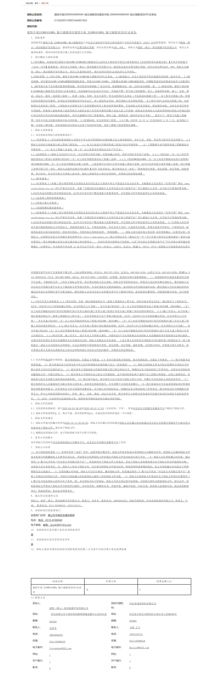 储能中国网获悉,9月19日,河北建投发布丰南200MW/400MWh独立储能项目EPC总承包招标公告。公告表示,本项目位于河北丰南经济开发区临港经济园第二起步区内,建设200MW/400MWh磷酸铁锂储能系统,共配置40套5MW/10MWh储能系统,同期配套建设包括集成电池单元及配套PCS、BMS等相关电气及电缆及配套附属设施,项目拟采用预制舱+厂房式布局,新建储能电站一座,220kV送出线路一条。 招标范围:包括储能电站及220kV升压站(含场地平整)等全部工程的勘察、设计、设备材料采购、施工、安装、调试、试运行、服务(包括竣工验收)、协调(征地、电网、社会关系等)等全过程的EPC总承包(不包括送出线路工程)。 招标人为建投(唐山)清洁能源开发有限公司。 原文如下: