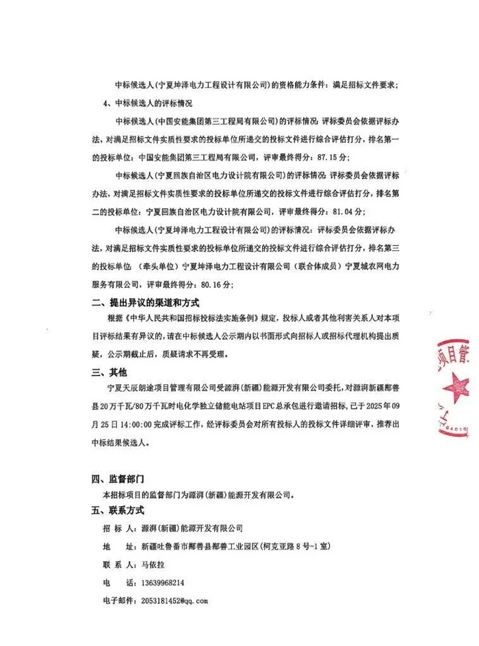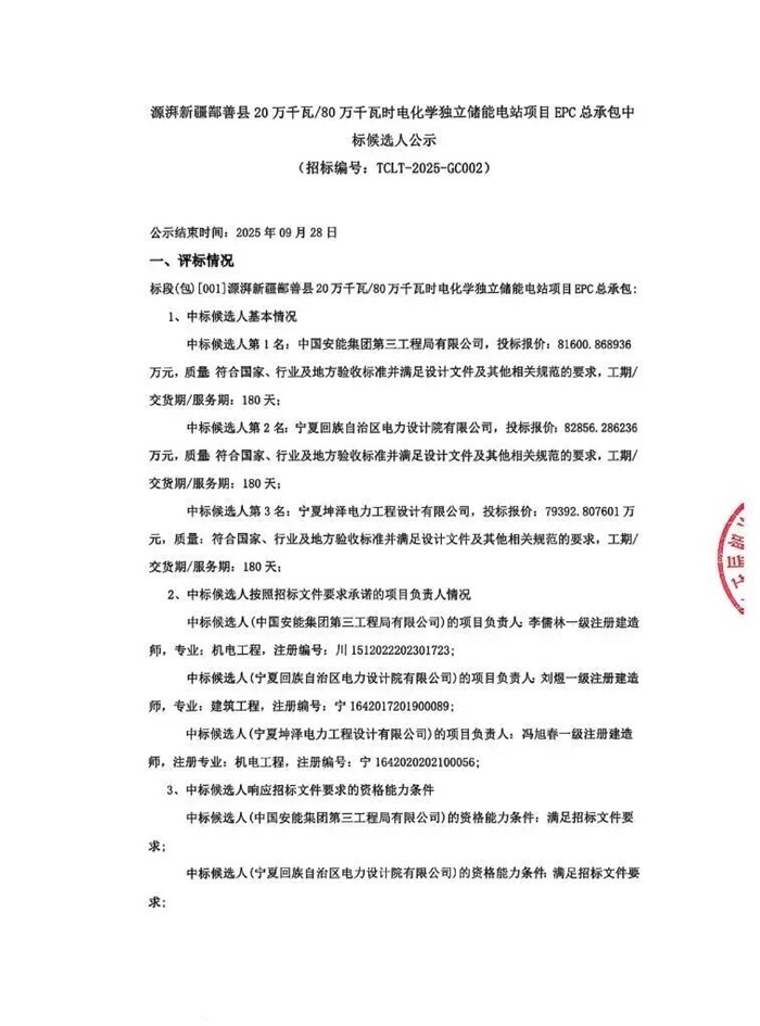 储能中国网获悉,9月26日,源湃新疆鄯善县20万千瓦/80万千瓦时电化学独立储能电站项目EPC总承包中标候选人公示。项目招标人为源湃(新疆)能源开发有限公司,项目位于新疆吐鲁番是鄯善县。 中标候选详情见下: 中标候选人第1名:中国安能集团第三工程局有限公司,投标报价:81600.868936万元,折合单价1.02元/Wh; 中标候选人第2名:宁夏回族自治区电力设计院有限公司,投标报价:82856.286236万元,折合单价1.036元/Wh; 中标候选人第3名:宁夏坤泽电力工程设计有限公司,投标报价:79392.807601万元,折合单价0.992元/Wh。 原公告如下: