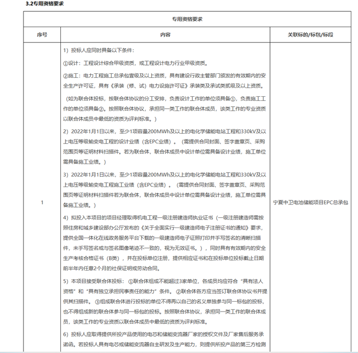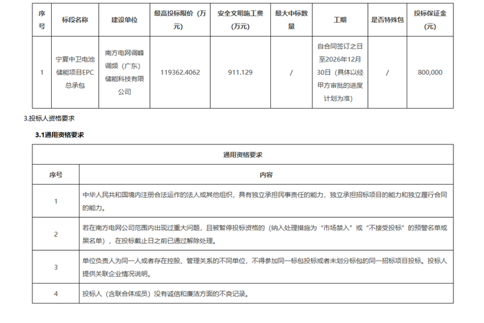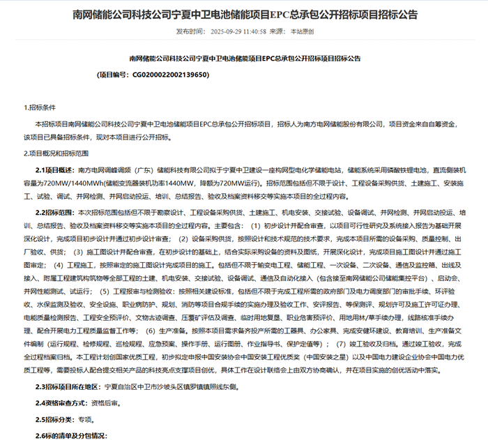 储能中国网获悉,9月29日,南方电网储能股份有限公司发布宁夏中卫电池储能项目EPC招标公告,项目资金来自自筹资金,最高投标限价119362.4062万元,约合0.8289元/Wh,项目位于宁夏中卫沙坡头。 项目拟建设一座构网型电化学储能电站,储能系统采用磷酸铁锂电池,直流侧装机容量为720MW/1440MWh。招标范用包括但不限于设计、工程设备采购供货、土建施工、安装施工、试验、调试、并网检测、并网启动投运、培训、总结报告、验收及档案资料移交等实施本项目的全过程内容。 招标公告原文如下: