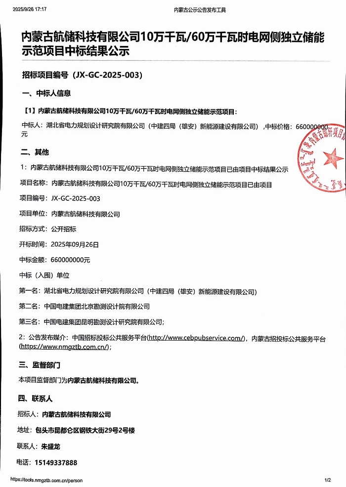 储能中国网获悉,近日,内蒙古航储科技有限公司发布包头10万千瓦/60万千瓦时电网侧独立储能示范项目EPC总承包中标结果公示。湖北省电力规划设计研究院有限公司(中建四局(雄安)新能源建设有限公司)以投标报价66000万元(折合单价1.1元/Wh)中标。 招标公告表示,项目拟选站址位于内蒙古自治区包头市昆都仑区卜尔汉图镇乌兰计二村,由内蒙古航储科技有限公司投资建设,计划总投资约8亿元;本项目规划容量为10万千瓦/60万千瓦时,储能系统采用预制舱式磷酸铁锂电池储能,本期一次建成。 招标范围:本工程包含设计、施工、采购一体化工程总承包。项目涵盖设计、采购、施工、调试、并网、验收、移交及保修等全过程。本项目全部设计、采购、建筑安装、调试、检测、并网试运行等全部内容以EPC总承包方式,设备及装饰性材料采购包括但不限于储能设备采购、主变、GIS(或AIS)、35kV配电装置、主控、电缆、设备的采购、催交、运输、接车、接货验收和仓储保管等所有设备及材料的采购。 根据招标公告,投标人自2021年1月1日至投标截止日(以合同签订时间为准),须至少具有1项100MWh及以上(独立储能或者配套储能)规模储能电站EPC总承包业绩;如为联合体投标,联合体各方均须满足业绩要求。 计划工期:计划2025年8月30日前开工,2025年12月30日前投产,实现全容量并网。具体开工日期以招标人或监理人书面通知为准。 原文如下: