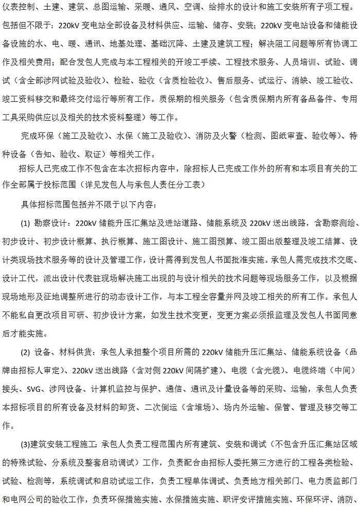 储能中国网获悉,近日,太原华景和顺新能源有限公司发布山西综改区潇河产业园400MW/800MWh构网型储能项目EPC总承包招标公告。招标人为太原华景和顺新能源有限公司。 山西综改区潇河产业园400MW/800MWh构网型储能项目建设容量为800MWh,建设功率为400MW,储能电站分为储能场地区域和220kV升压站区域。储能场地区域采用户外一体舱布置电池舱与PCS舱分舱布置,电池选用磷酸铁锂电池,PCS舱采用变流升压一体结构。储能电池舱经PCS交直流转换逆变升压后接入升压变电站35kV母线,35kV母线汇流后升压至220kV,220千伏升压站部分采用2台200MVA主变,以1回220kV线路就近接入太原智储220kV升压站220KV母线实现并网。 项目计划开工日期:2025年11月(具体开工日期以实际日期为准),工期270日历天。 招标公告原文如下: