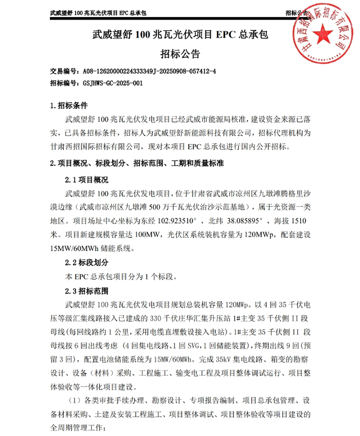 储能中国网获悉,近日,武威望舒100兆瓦光伏项目EPC总承包中标结果公示,中国电建集团昆明勘测设计研究院有限公司&中铁十四局集团西北工程有限公司联合体以21366.9528万元(折合单价1.78元/W)中标。 根据招标公告,该项目由甘肃电力投资集团下属的武威望舒新能源科技有限公司投资建设,位于甘肃省武威市凉州区九墩滩腾格里沙漠边缘(武威市凉州区九墩滩500万千瓦光伏治沙示范基地),新建规模100MW,光伏区系统装机容量为120MWp,配套建设15MW/60MWh储能系统。