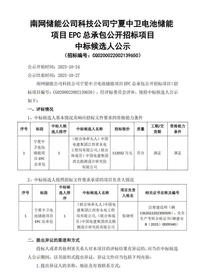 | 储能中国网获悉,10月24日,南网储能公司科技公司宁夏中卫电池储能项目EPC总承包公开招标项目中标候选人公示。公告显示,中国电建集团江西省水电工程局有限公司&中国电建集团西北勘测设计研究院有限公司联合体以投标报价为112032万元,(折合单价为0.778元/Wh)预中标。 根据招标公告,该项目位于宁夏自治区中卫市沙坡头区镇罗镇镇照线东侧,南方电网调峰调频(广东)储能科技有限公司拟于宁夏中卫建设一座构网型电化学储能电站,储能系统采用磷酸铁锂电池,直流侧装机容量为720MW/1440MWh(储能变流器装机功率1440MW,降额为720MW运行) 中标候选人公示原文如下:
