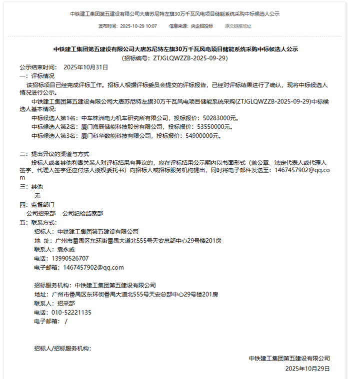 | 储能中国网获悉,10月29日,中铁建工集团第五建设有限公司大唐苏尼特左旗30万千瓦风电项目储能系统采购中标候选人公示。根据公示,中车株洲电力机车研究所有限公司以投标报价50283000元预中标。 中标候选人情况为, 中标候选人第1名:中车株洲电力机车研究所有限公司,投标报价:50283000元。 中标候选人第2名:厦门海辰储能科技股份有限公司,投标报价:53550000元。 中标候选人第3名:厦门科华数能科技有限公司,投标报价:54900000元。 招标公告表示,投标人近三年在中国境内具有累计不低于1GWh磷酸铁锂电池储能系统集成业绩,其中须具有两个单体项目容量为100MWh及以上的磷酸铁锂电化学储能系统集成设备(至少包含电池室/舱、BMS、PCS)的投运业绩。 中标候选人公示原文如下: