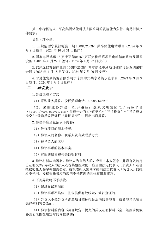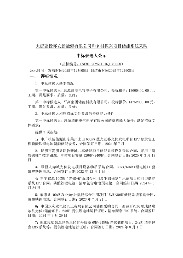 储能中国网获悉,2025年12月5日,大唐建投怀安新能源有限公司和乡村振兴项目储能系统采购项目发布中标候选人公示。思源清能电气电子有限公司以投标报价13600440.00 元预中标。 中标候选人情况如下: 第一中标候选人:思源清能电气电子有限公司,投标报价约1360万元,折合投资单价约0.5397元/Wh; 第二中标候选人:平高集团储能科技有限公司,投标报价约1475万元,折合单价约0.5854元/Wh。 该项目位于河北,容量为12.6MW/25.2MWh,磷酸铁锂电池储能系统(电池单体的标称容量≥280Ah,储能系统(含电池)整体质保5年),包括储能电池、PCS、EMS、BMS、35kV变压器、交直流汇流设备、预制舱及其配套设备、专用工具、备品备件、技术服务等。 大唐建投怀安新能源有限公司,成立于2023年3月,注册资本500万元,住所为河北省张家口市怀安县,由大唐国际发电股份有限公司(大唐发电 601991.SH/ 00991.HK)、张家口建设投资集团共同出资设立。 中标候选人公示原文如下: