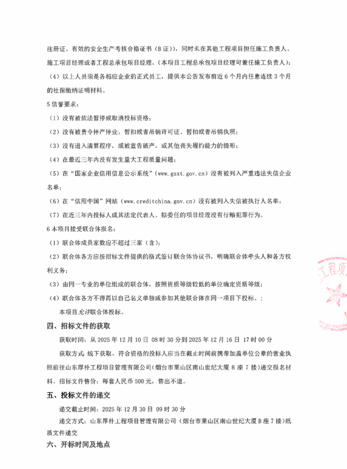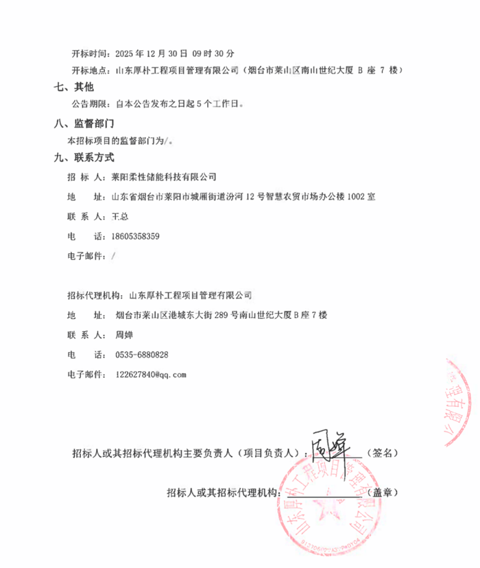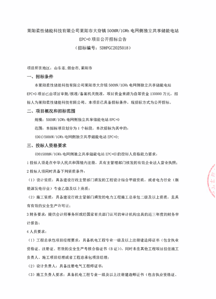 储能中国网获悉,2025年12月10日,莱阳柔性储能科技有限公司发布莱阳市大夼镇500W/1GWh电网侧独立共享储能电站EPC+O项目招标公告,项目资金来源为自筹资金,总投资130000万元(折合单价1.3元/Wh)。招标人莱阳柔性储能科技有限公司为柔性(南京)储能科技有限公司全资子公司。 项目所在地区为山东省烟台莱阳市。本项目接受联合体投标,联合体成员家数应不超过三家。 文件获取时间为2025年12月10日08时30分到2025年12月16日17时。 原文如下: